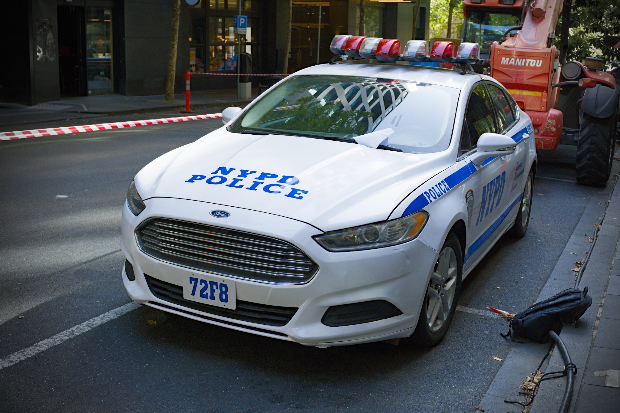 Photo of a white Ford sedan parked on the side of a narrow city road in Melbourne, Australia that will eventually become a film set. An orange crane with cinema lights mounted on top of it is parked behind this car. There are lights on top of this car that identify it as an American police vehicle. Blue stickers pasted on the car read, “NYPD Police”.