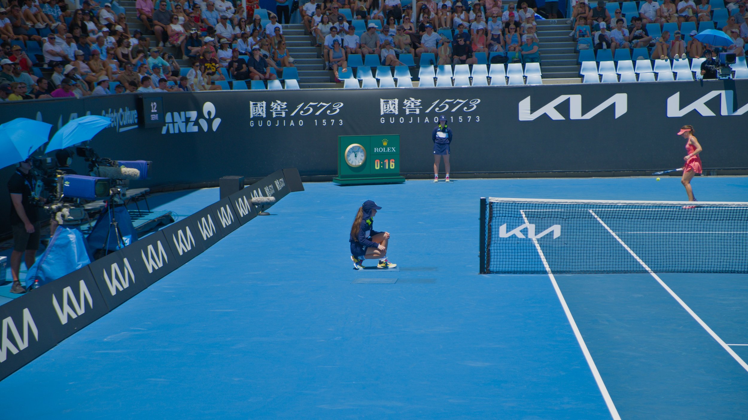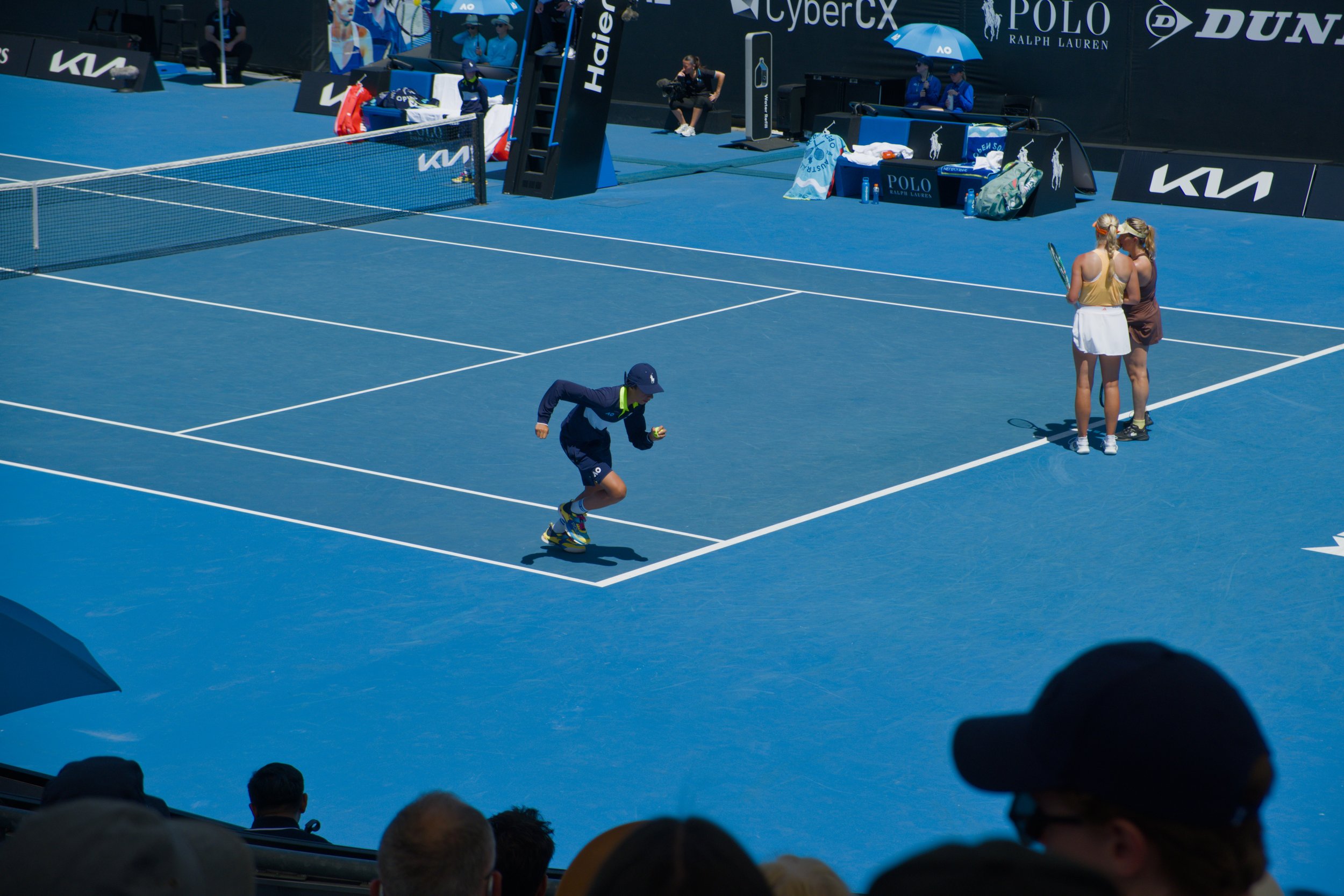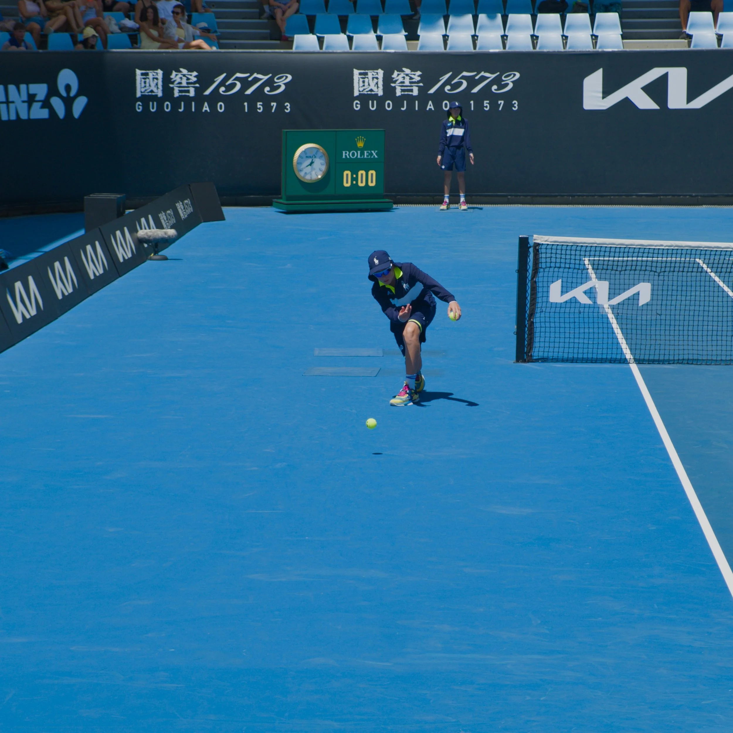 Photo of a ball kid in blue shorts, a blue shirt, and a blue hat rolling tennis balls across a blue-coloured tennis court to another ball kid that’s off-camera.