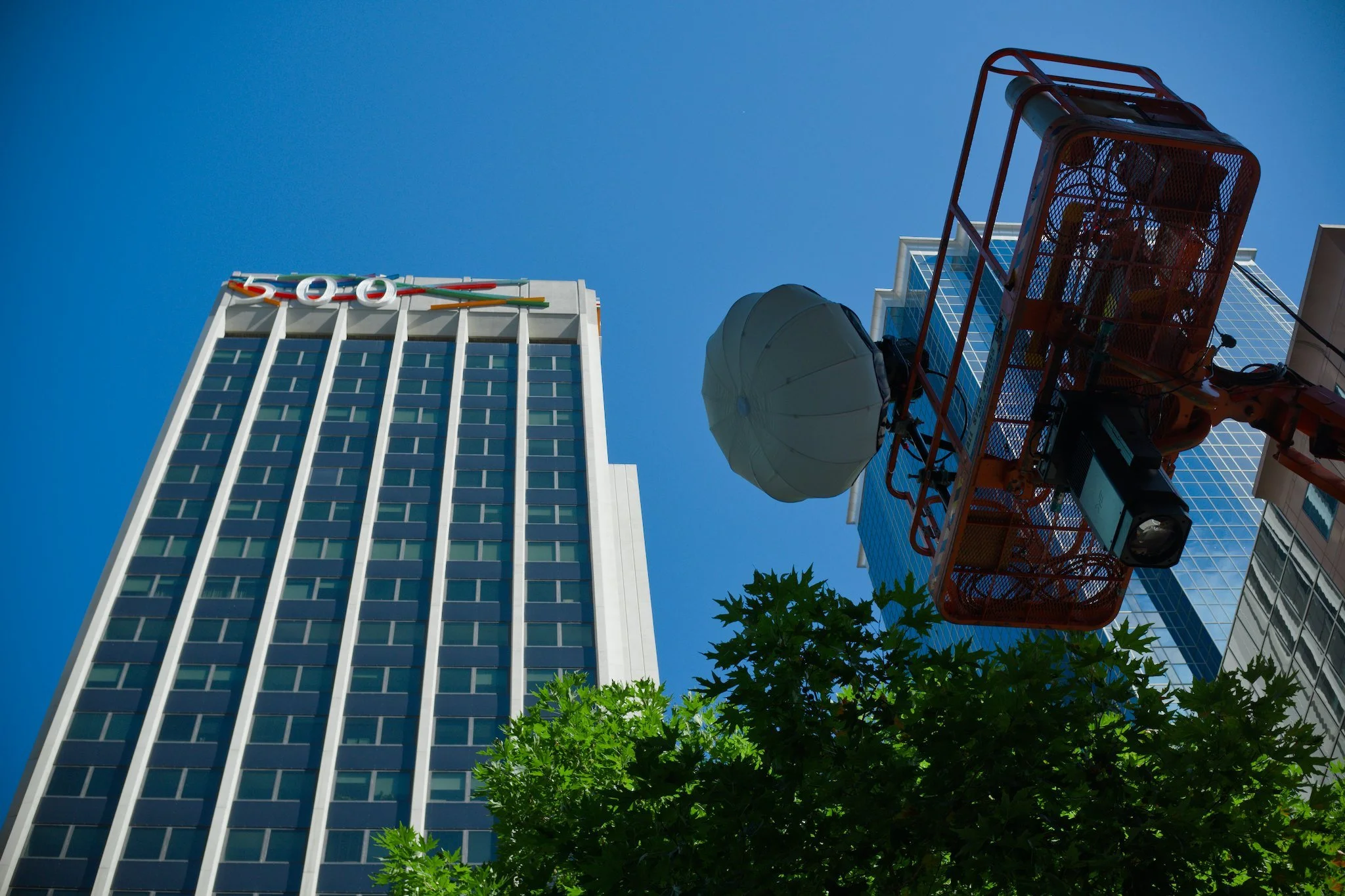 Photo looking up at a powerful cinema light mounted on a crane. The light is covered by a large, lantern-shaped soft box, which is a box made out of white cloth that softens the light that's coming from the LED bulbs.