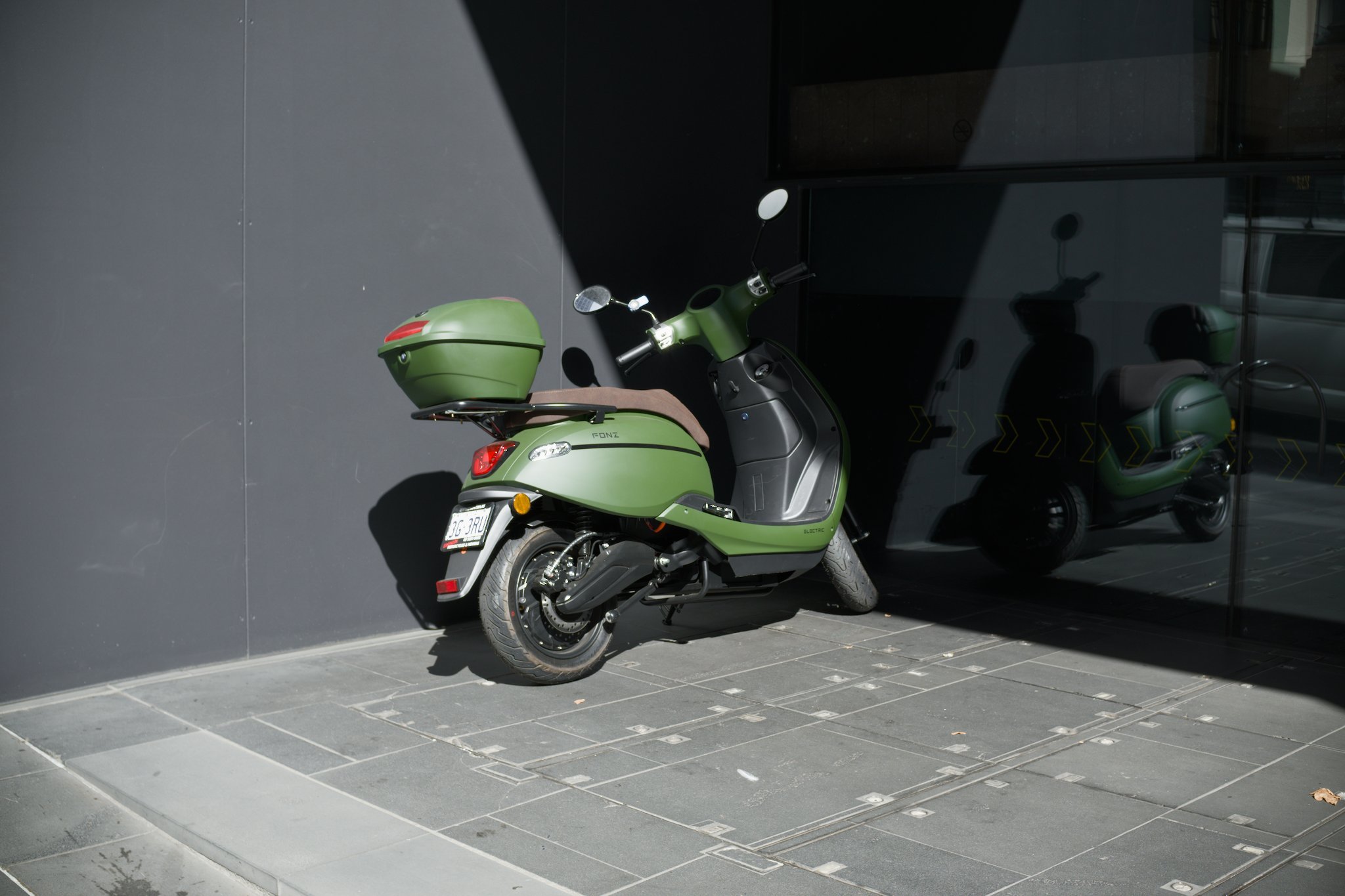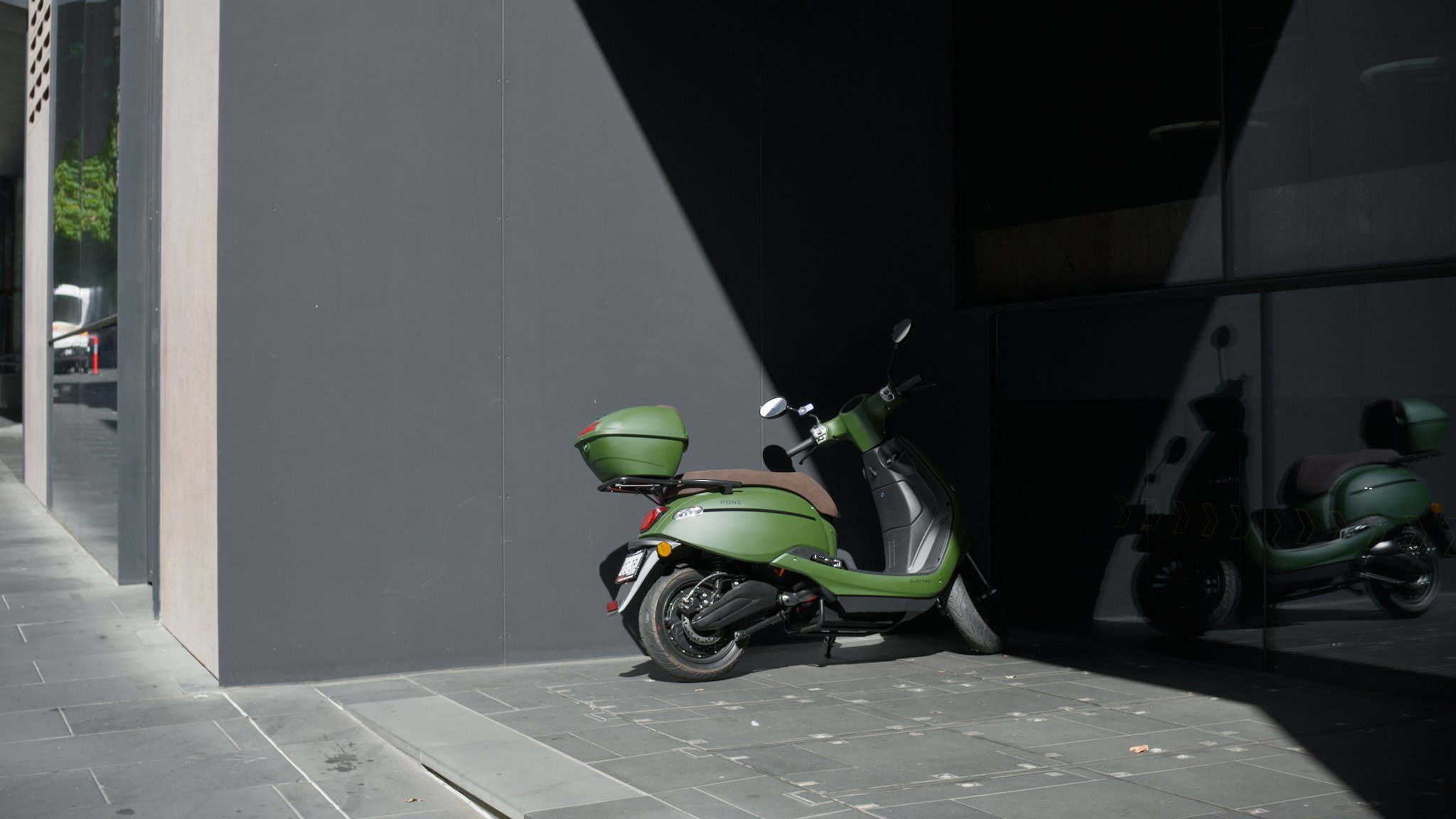 Photo of a dark green, classic Italian style, electric motorcycle parked on the pavement outside a building. The font of the motorcycle is in shadow of the building, but the back is brightly lit by the sun.