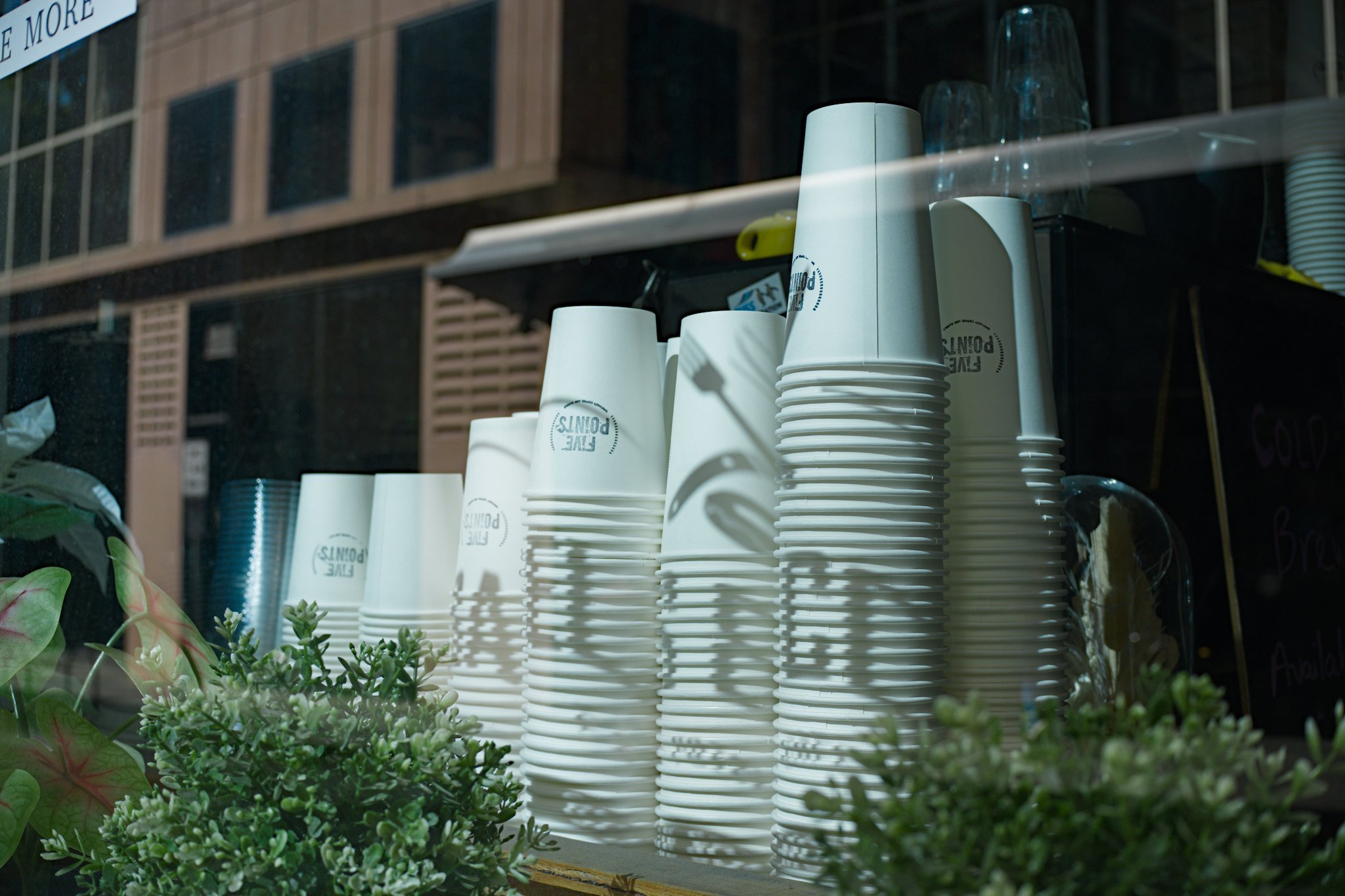 Photo through the shop window of a stack of paper coffee cups stacked neatly next to a coffee machine in a cafe. The ‘Five Points’ wordmark is stamped on each coffee cup.