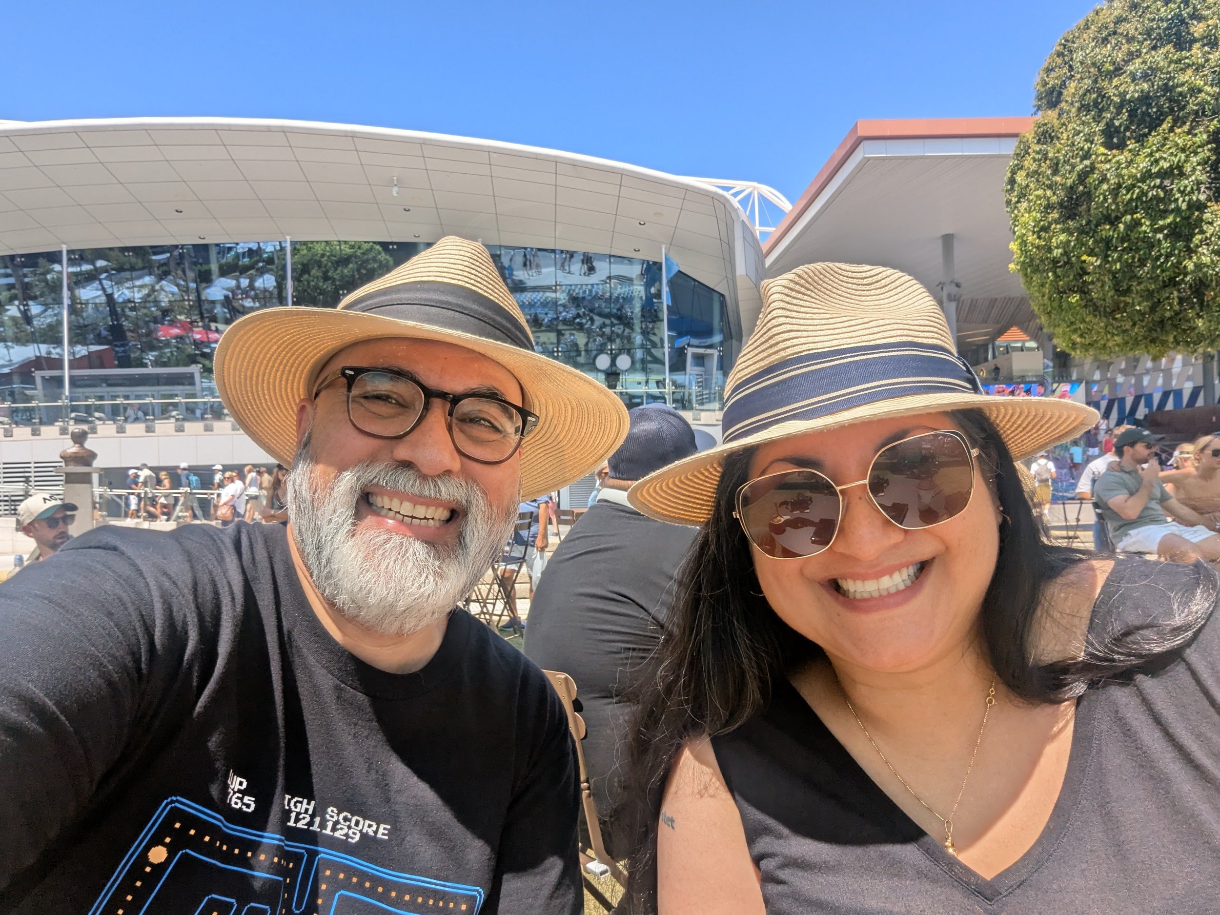 Selfie of a man and a woman sitting outside a tennis complex on a sunny day. The man is wearing a black t-shirt and glasses; the woman is wearing a black sleeveless top and sunglasses. They are both wearing straw hats.