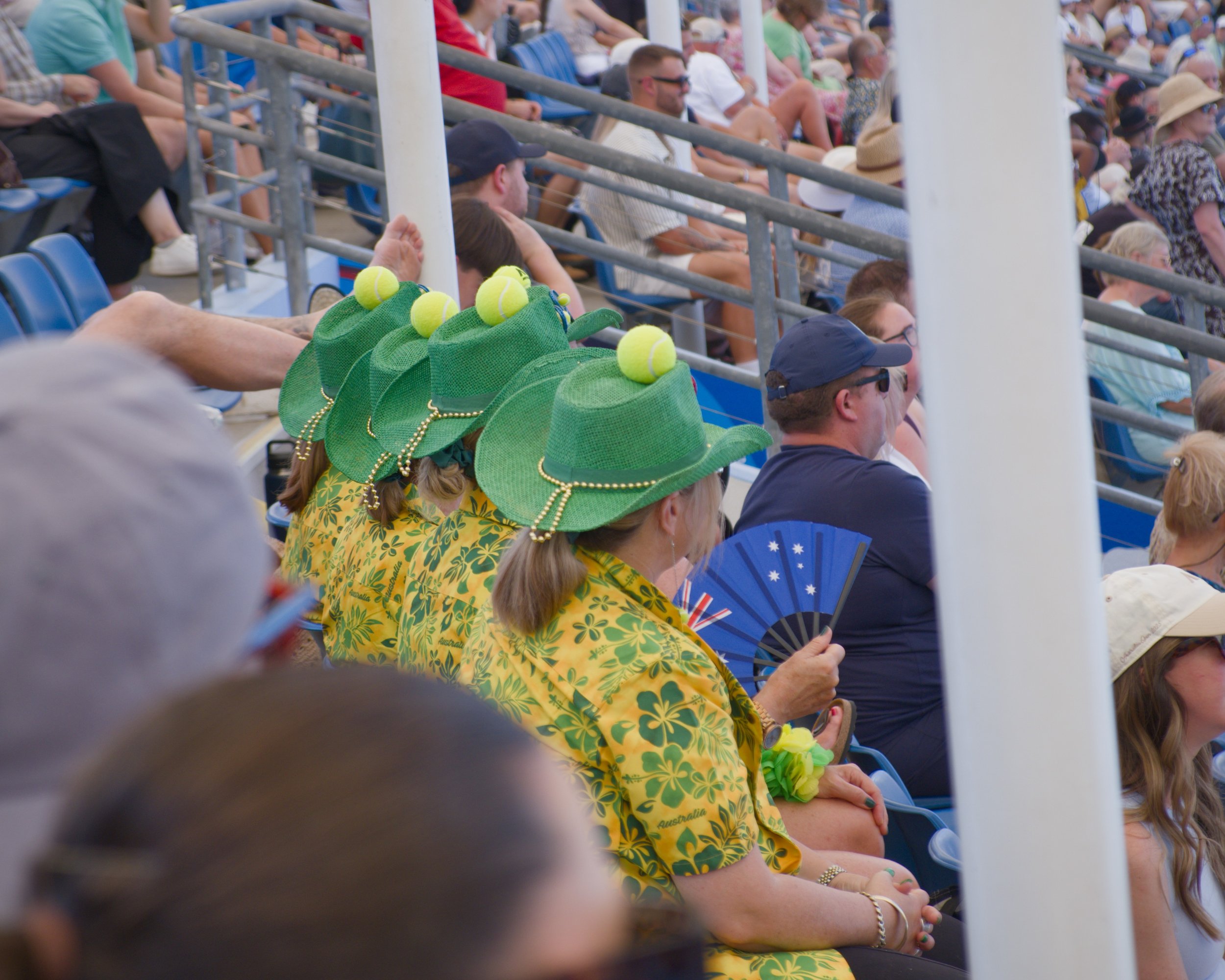 Photo of five women sitting in a row in the stands of a tennis court during a tournament. They are all wearing identical, patterned green-and-yellow tops as well as green straw hats with a yellow tennis ball affixed to the top.