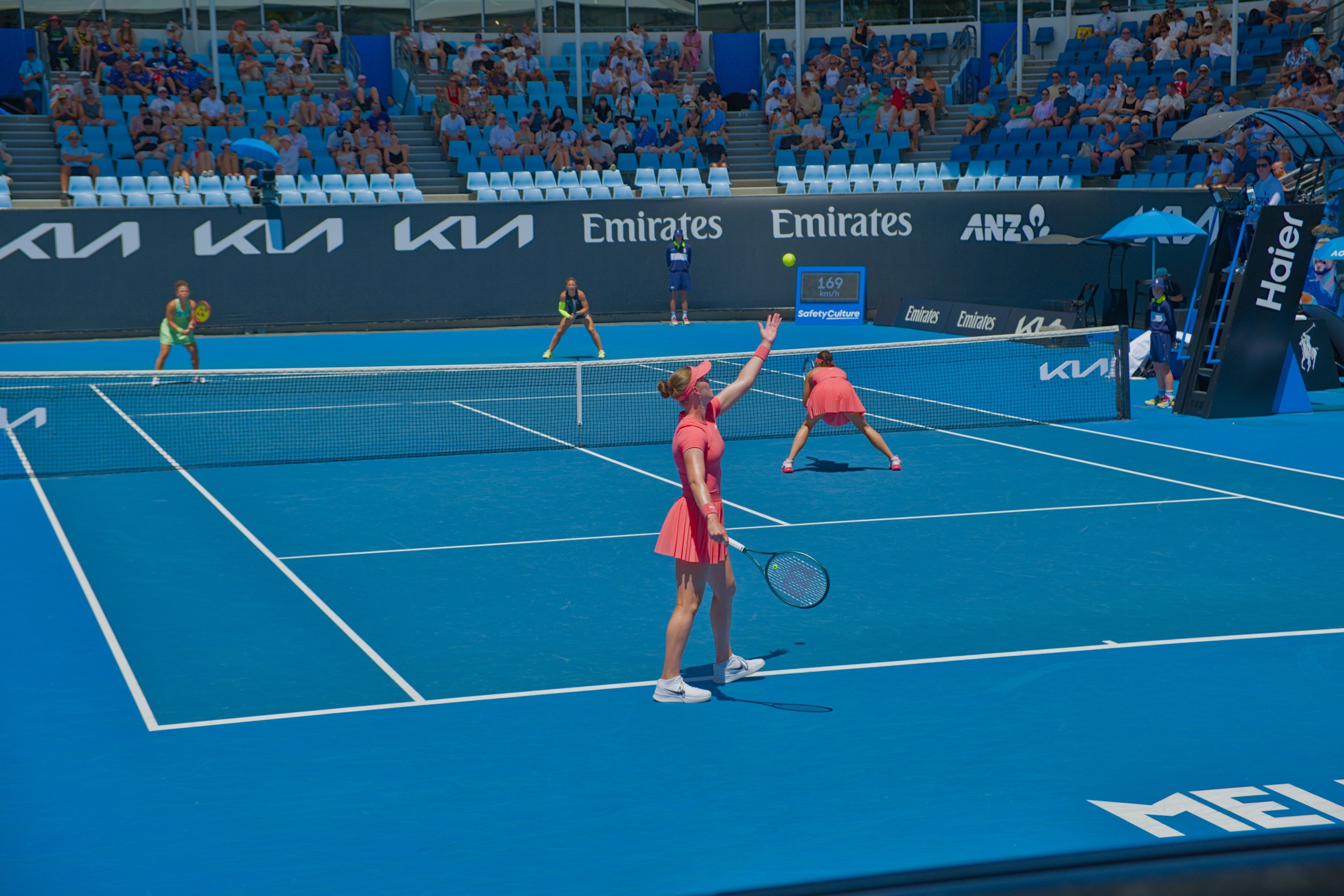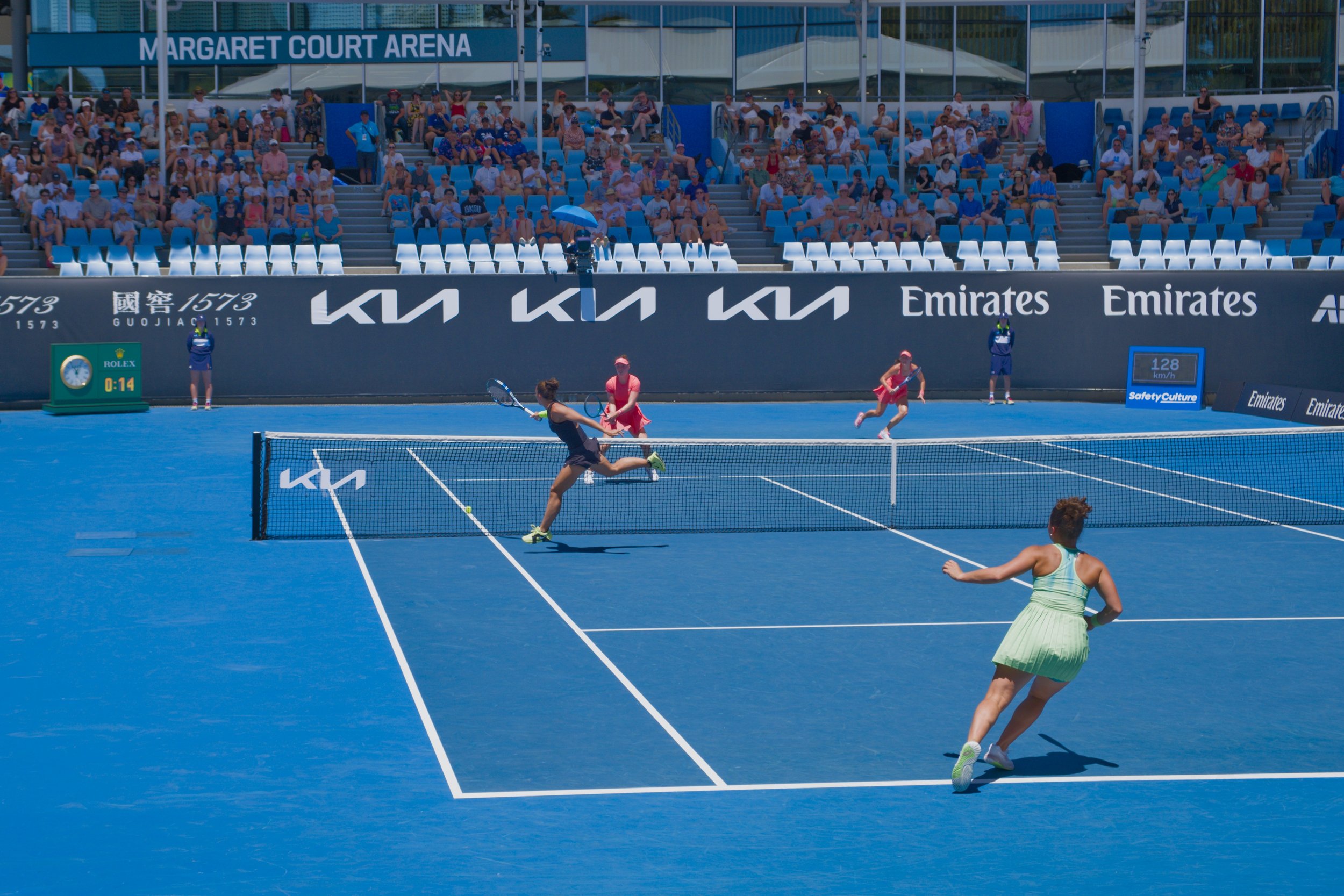 Photo of professional tennis player Talia Gibson (Australia) mid-swing as she prepares to strike a tennis ball during her women’s doubles match.