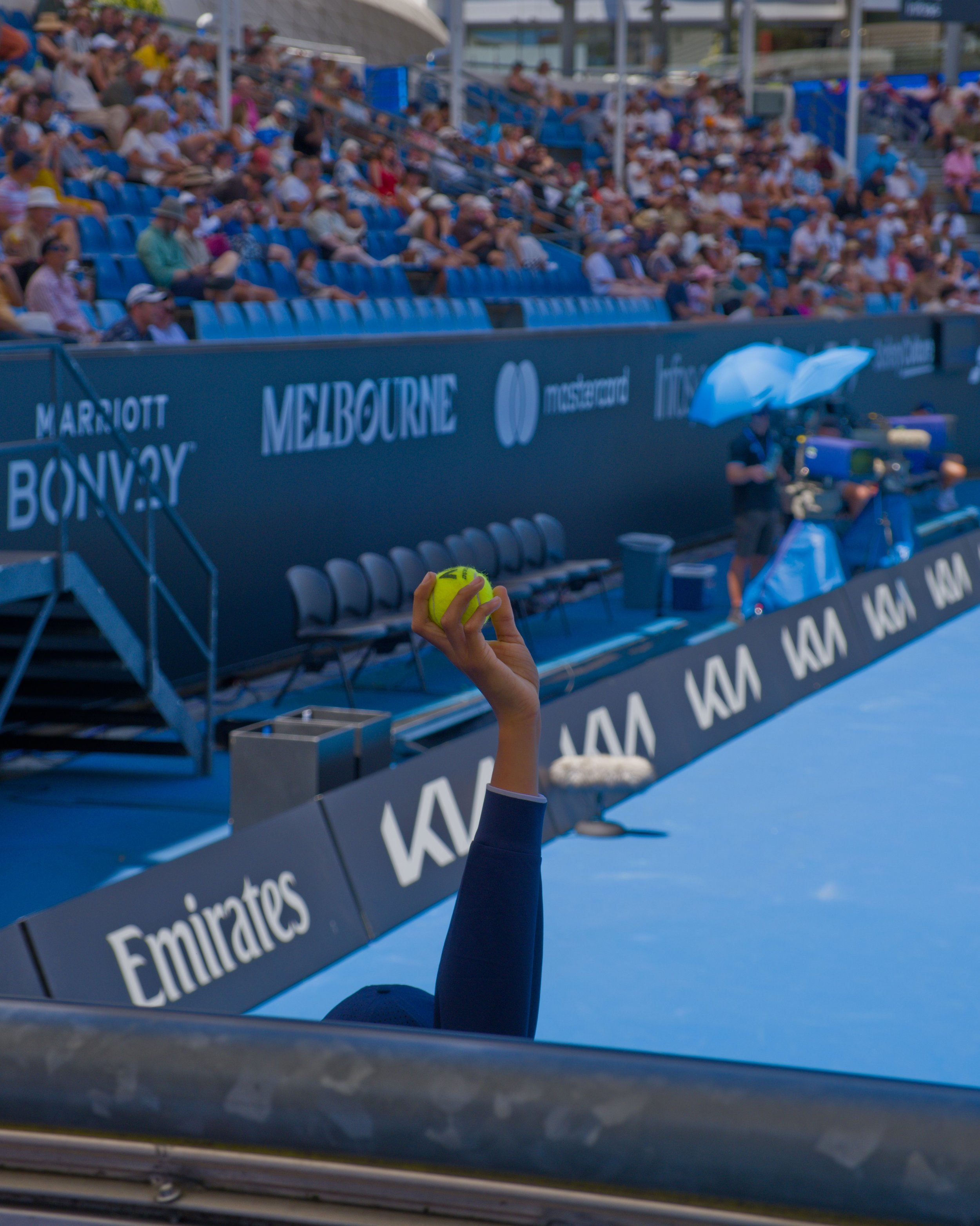 Photo of a ball kid holding up a tennis ball in case the serving tennis player wants another ball. Only the top of the ball kid’s hat at the ball kid’s arm are visible, with the rest being blocked from view by the wall of the tennis court.