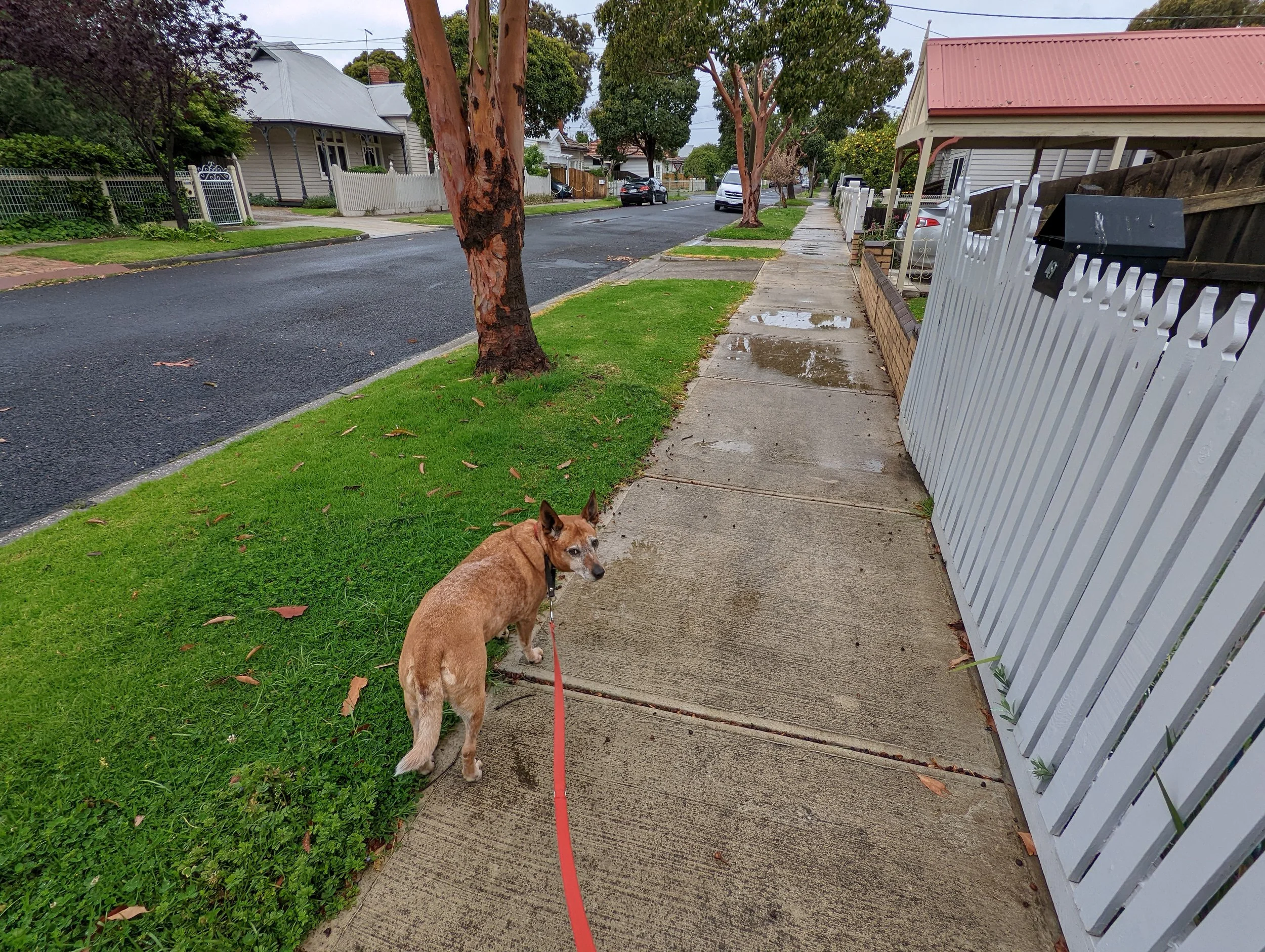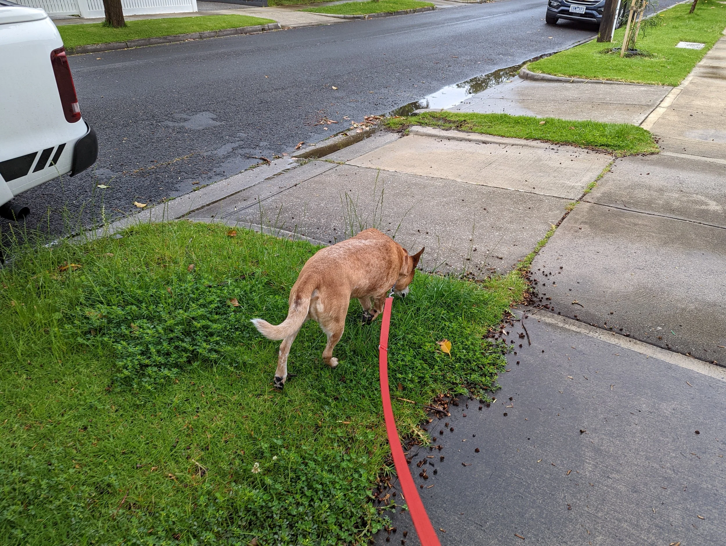 A red dog being walked on a lead in a residential neighbourhood sniffs at a patch of grass in the nature strip by the side of the road.