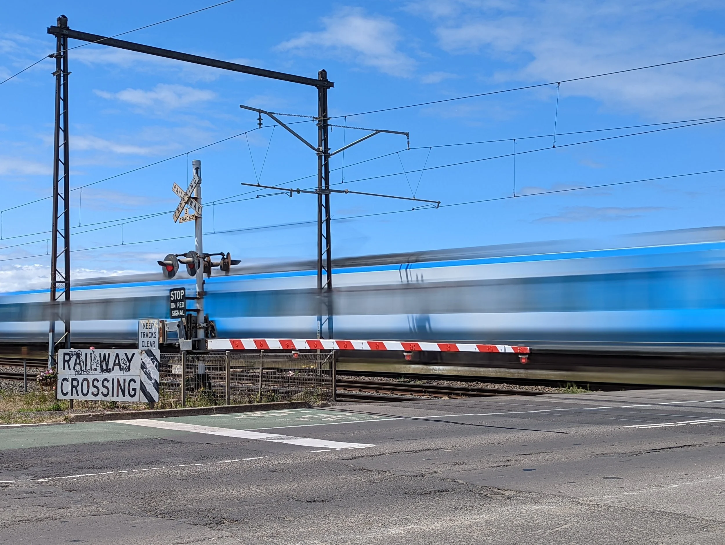 Selective long-exposure photo of a train passing through a level crossing. Only the moving train has had the long exposure effect applied to it, so it’s the only object in the photo with motion blur.