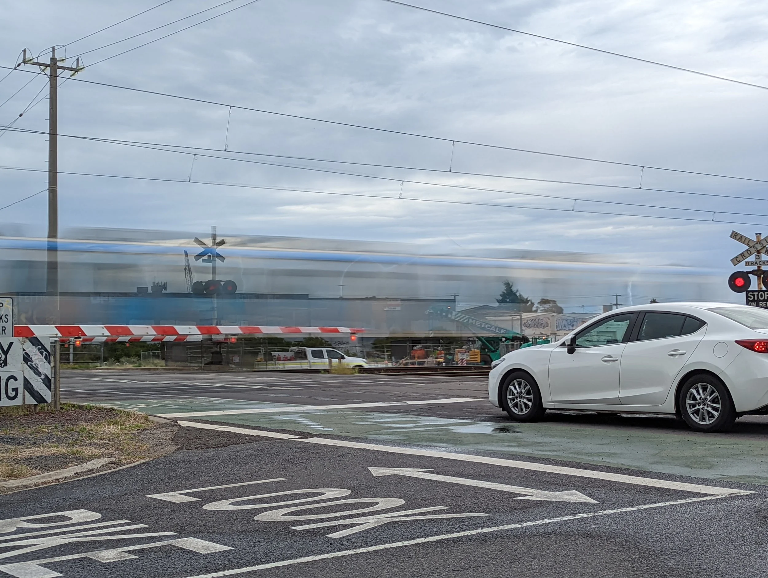 Selective long-exposure photo of a train passing through a level crossing. The moving train is the only element of the photo that has a motion blur effect applied to it. Because one of the long-exposure photos taken was from before the train appeared within the frame, the train in the final image appears to be semi-transparent. A white car has stopped in front of the lowered boom gate of the level crossing.