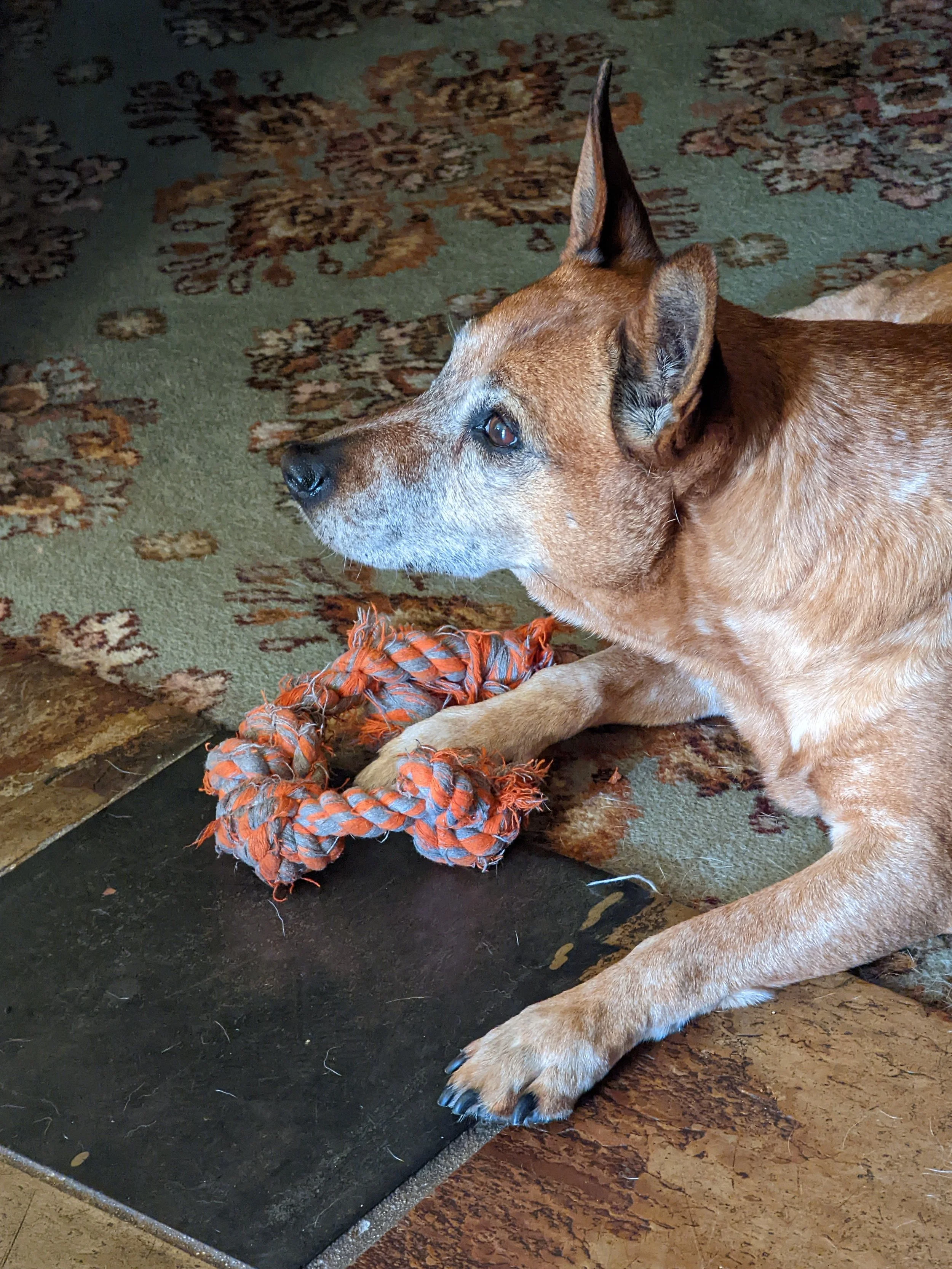 Photo of a red dog on a carpet, with one of its paws on an orange and grey rope toy. The dog has interrupted its play and is looking up intently at someone off-camera.