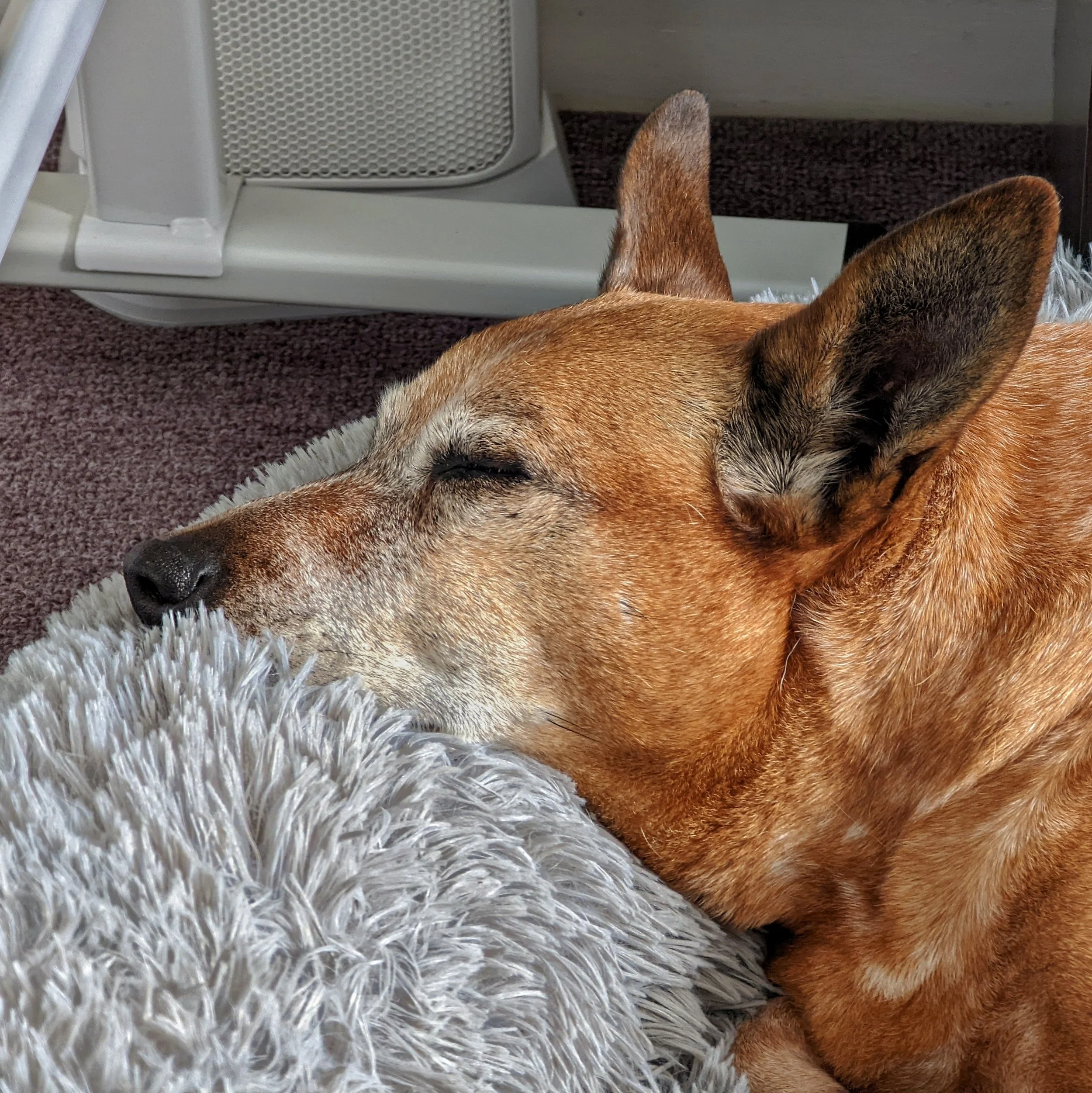 Close up photo of a sleeping red/brown dog with its head resting on the side of a fuzzy dog bed.