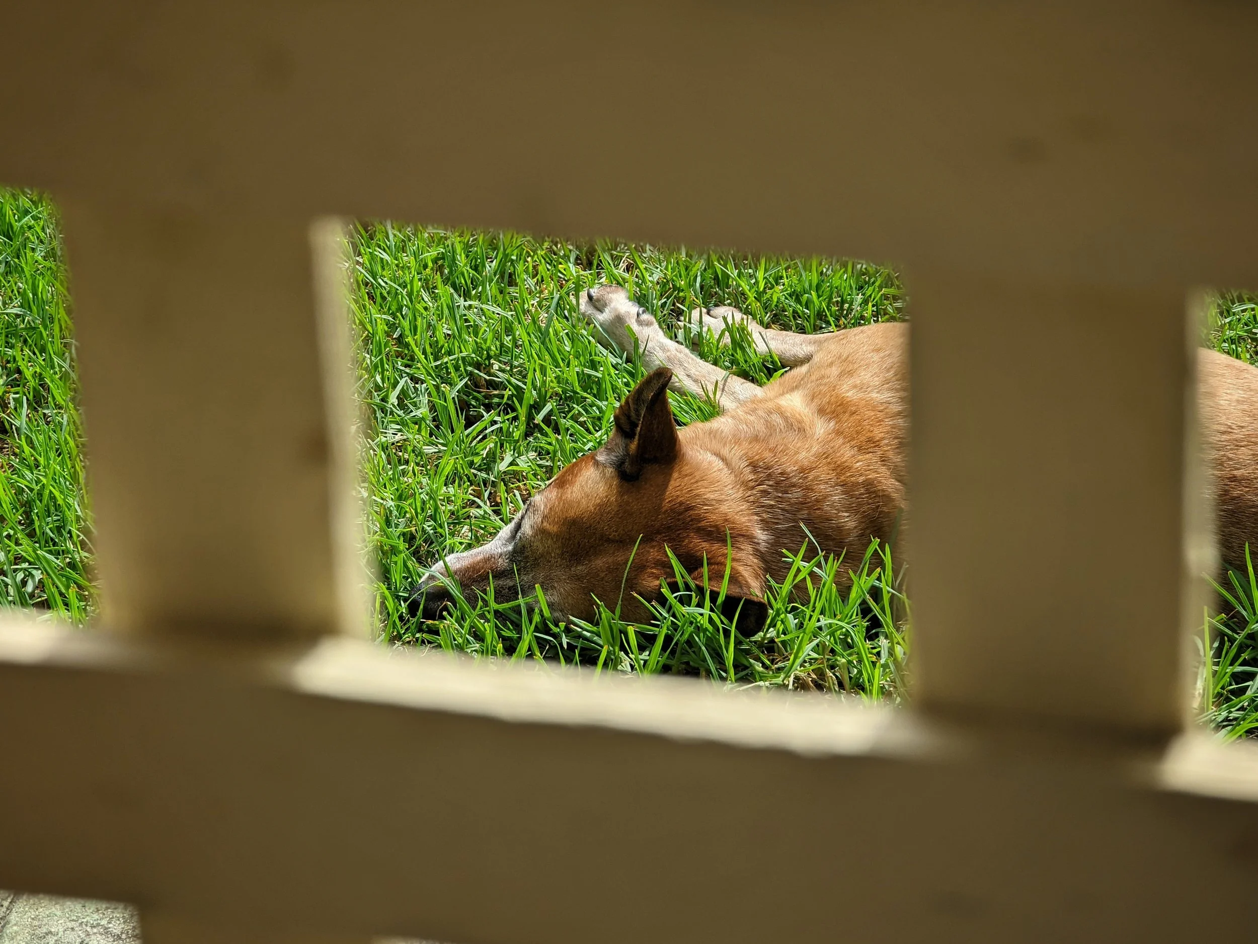 Photo of a red/brown dog that’s been taken through a wooden trellis. The dog is sleeping on its side on the grass on a sunny day.