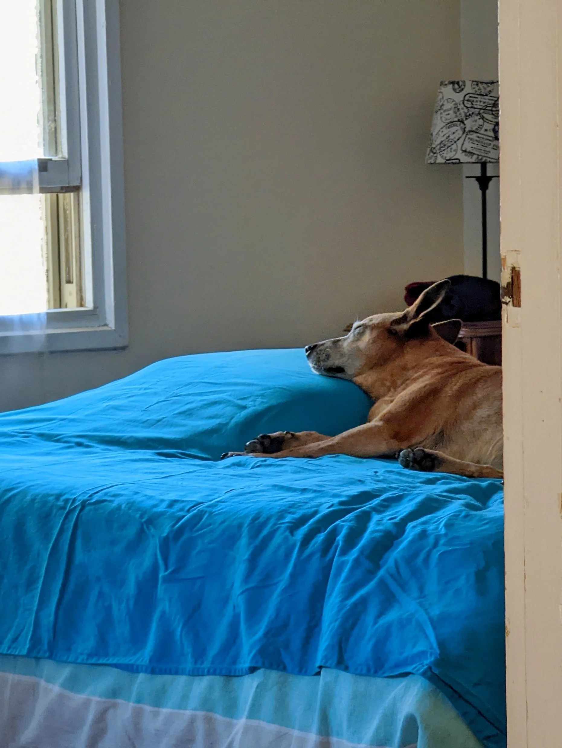 Photo of a red/brown dog sleeping soundly on a human bed with its head propped up on a pillow.
