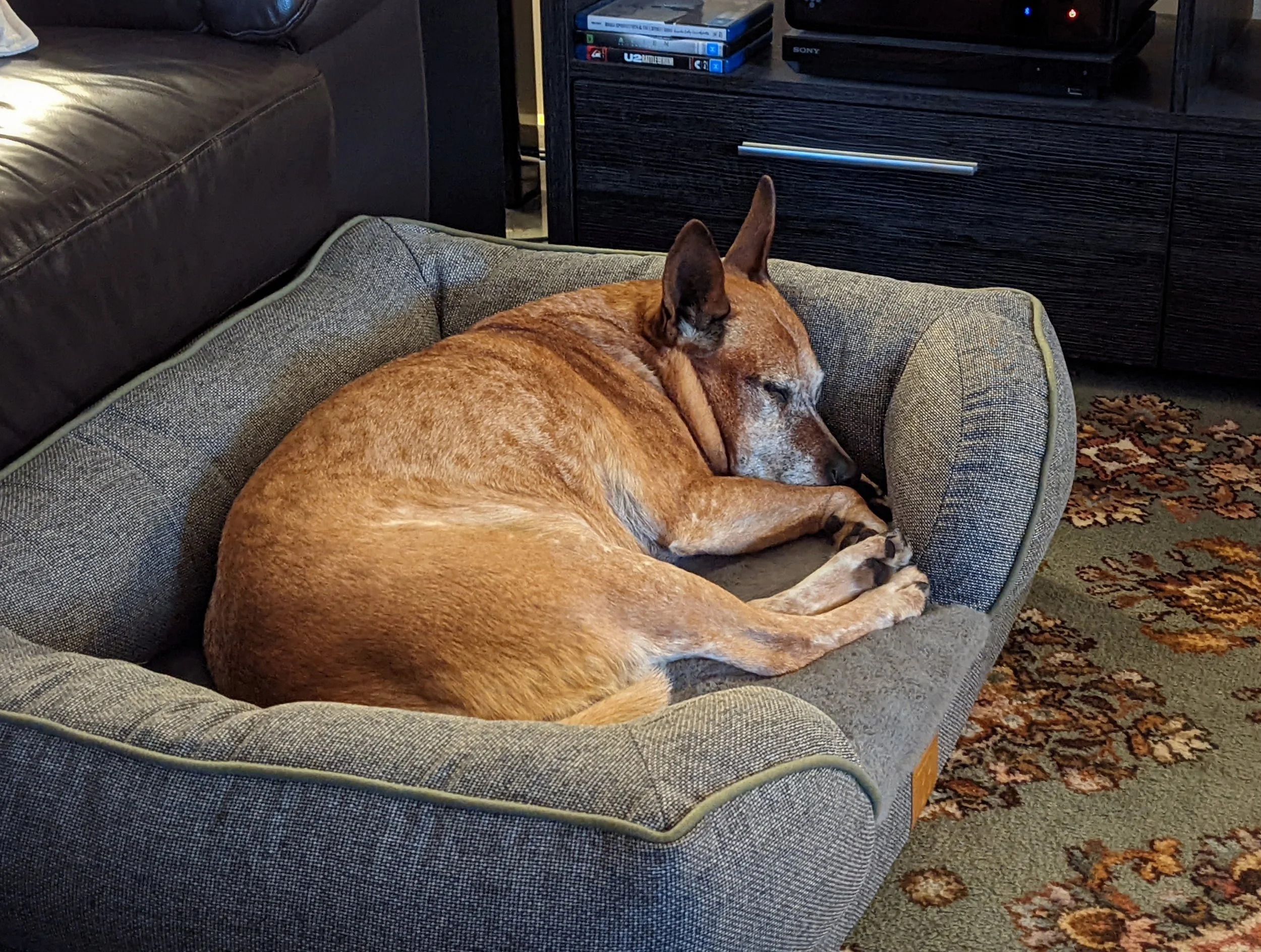 Photo of a red/brown dog curled up and fast asleep in a comfy dog bed in a carpeted room.