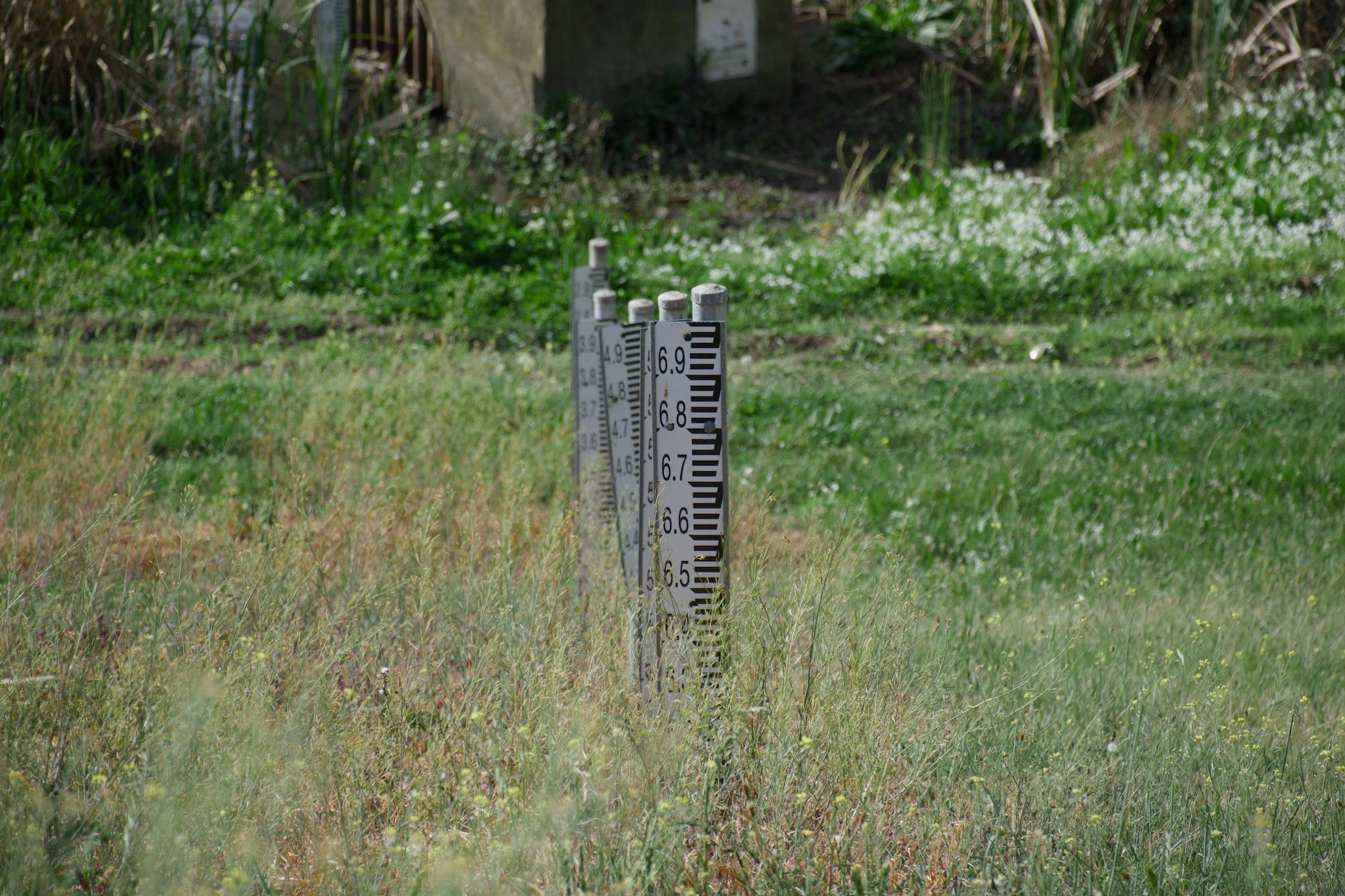 Flood-level markers along a creek in a floodplain