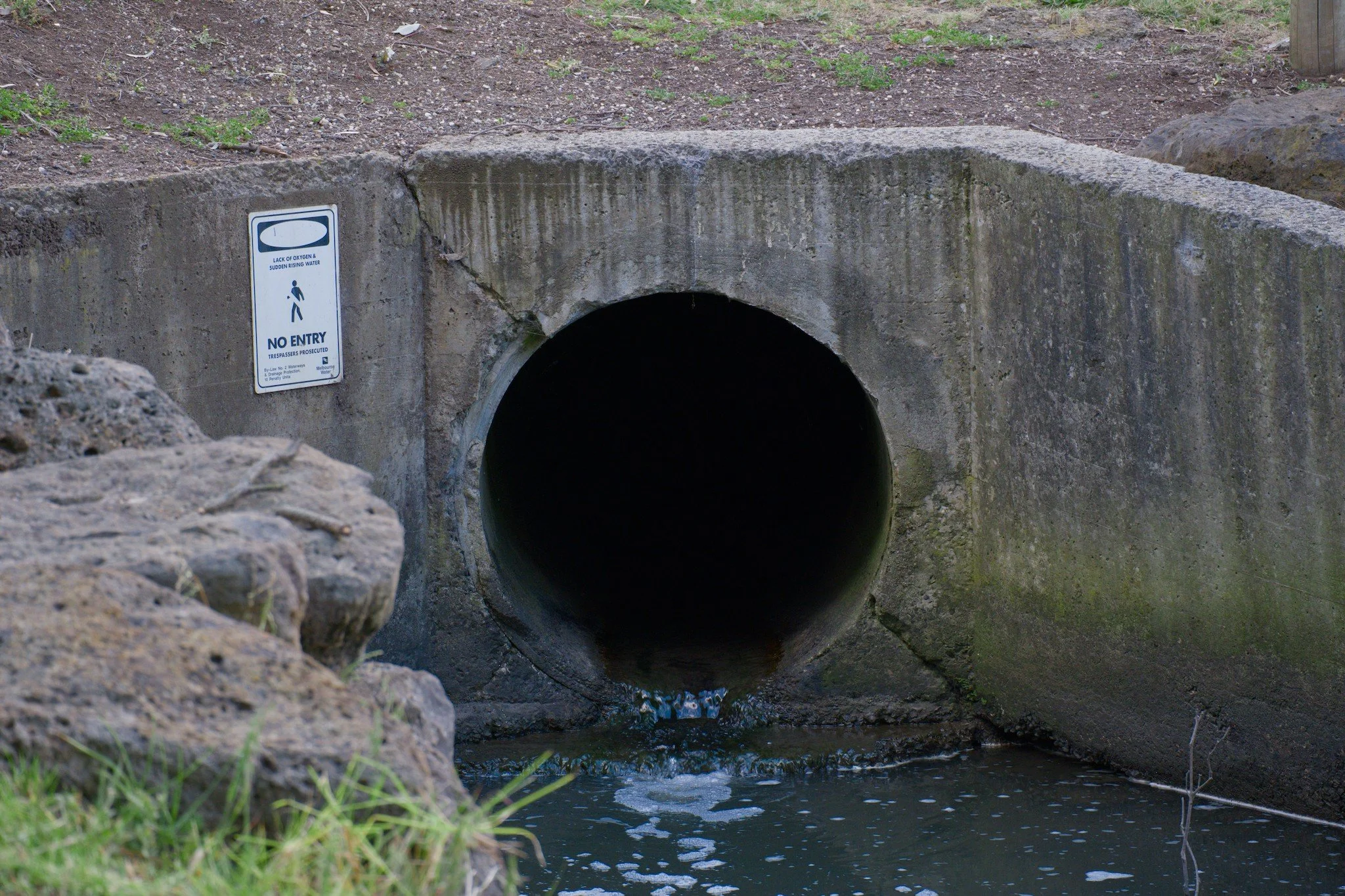 Photo of a round culvert around a floodplain. Even though it is daylight outside, the interior of the culvert is pitch dark. A warning sign posted next to the entrance hole reads, “no entry” and “trespassers prosecuted”. Explanatory text above this reads, “lack of oxygen and sudden rising water”.