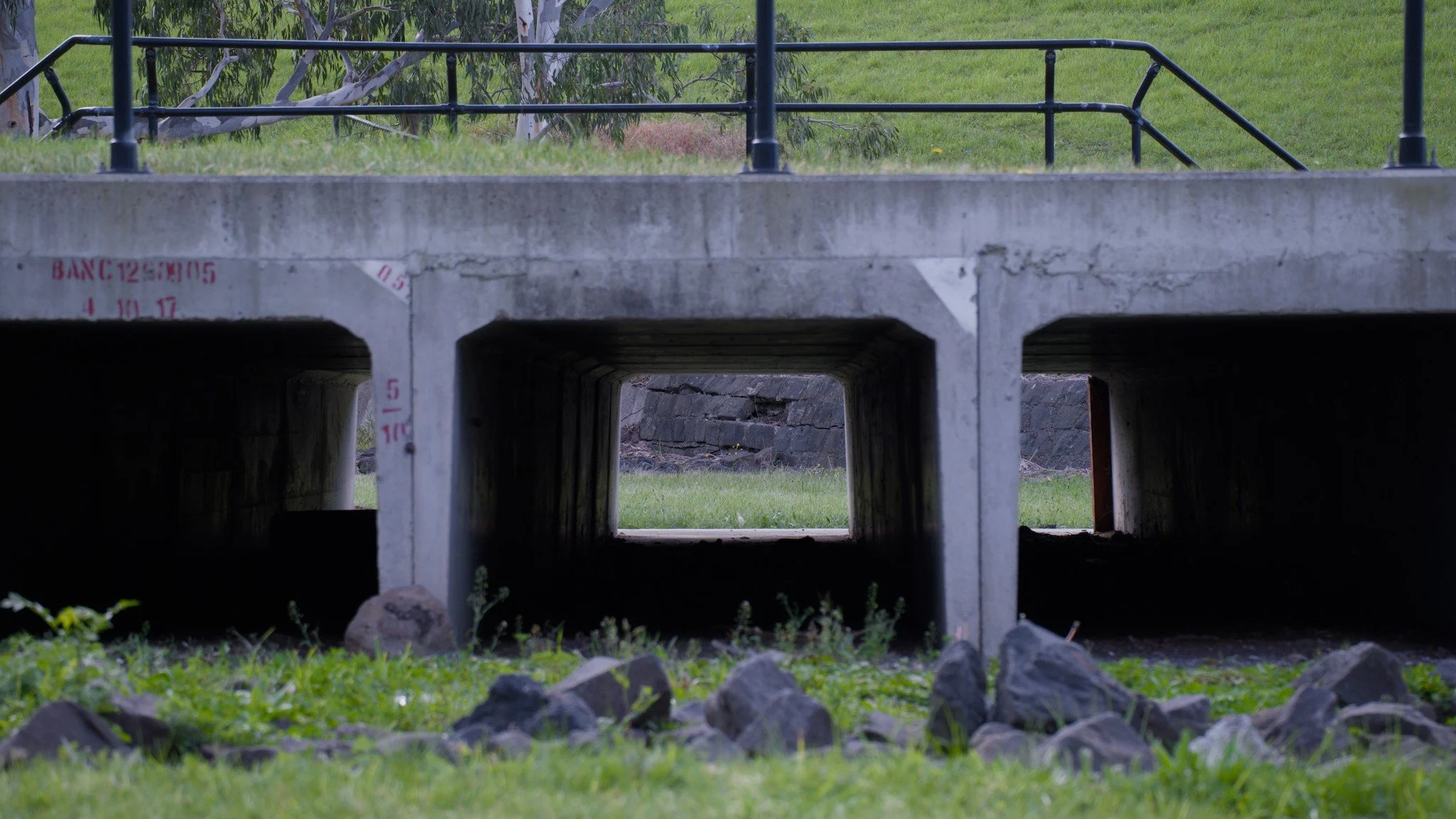 Photo of a set of large, rectangular culverts underneath a concrete walking path in a grassy area.