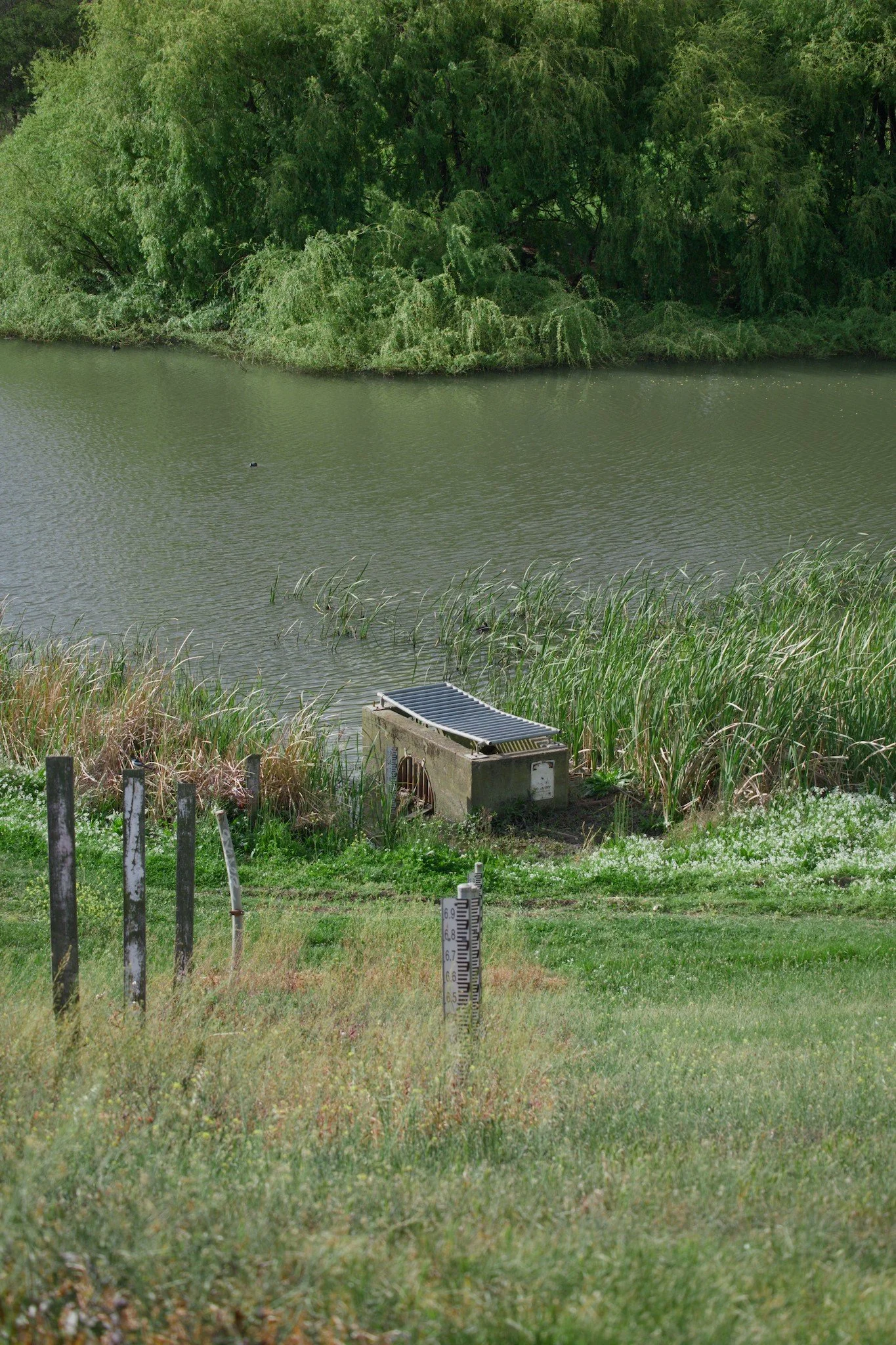 Photo looking down at a creek running through a grassy area. There are structures built along this creek to manage its flooding, such as a drain pipe that redirects flood waters via smaller creek into a flood retarding basin. A series of flood-level markers have been installed along the wall of this creek so observers can note the height of the floodwater.
