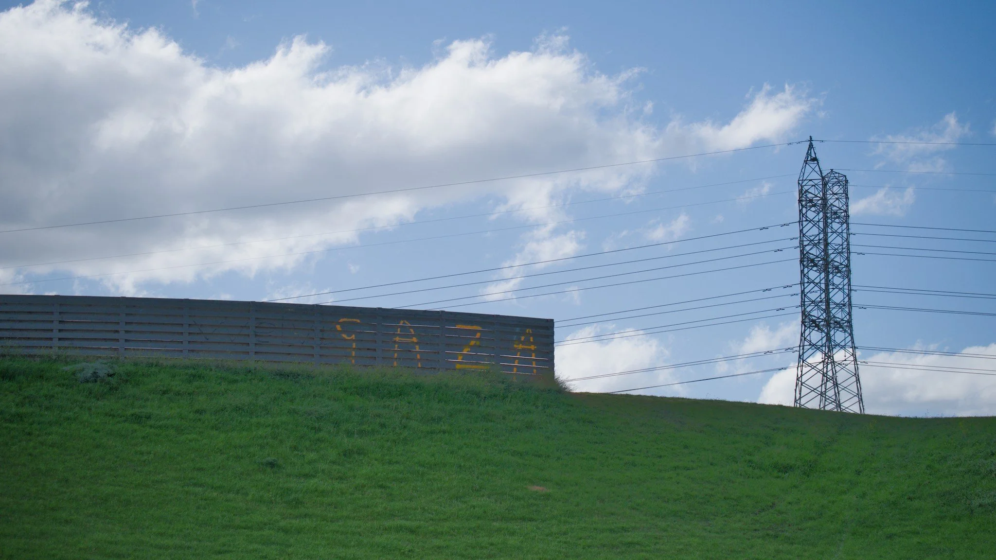 Photo of a sound- and wind-dampening fence that's been erected along the top of a rise that's next to a floodplain. Spray painted on the fence is graffiti that reads, “WE LUV U GAZA”. In the background of the photo are high-voltage electricity transmission towers.