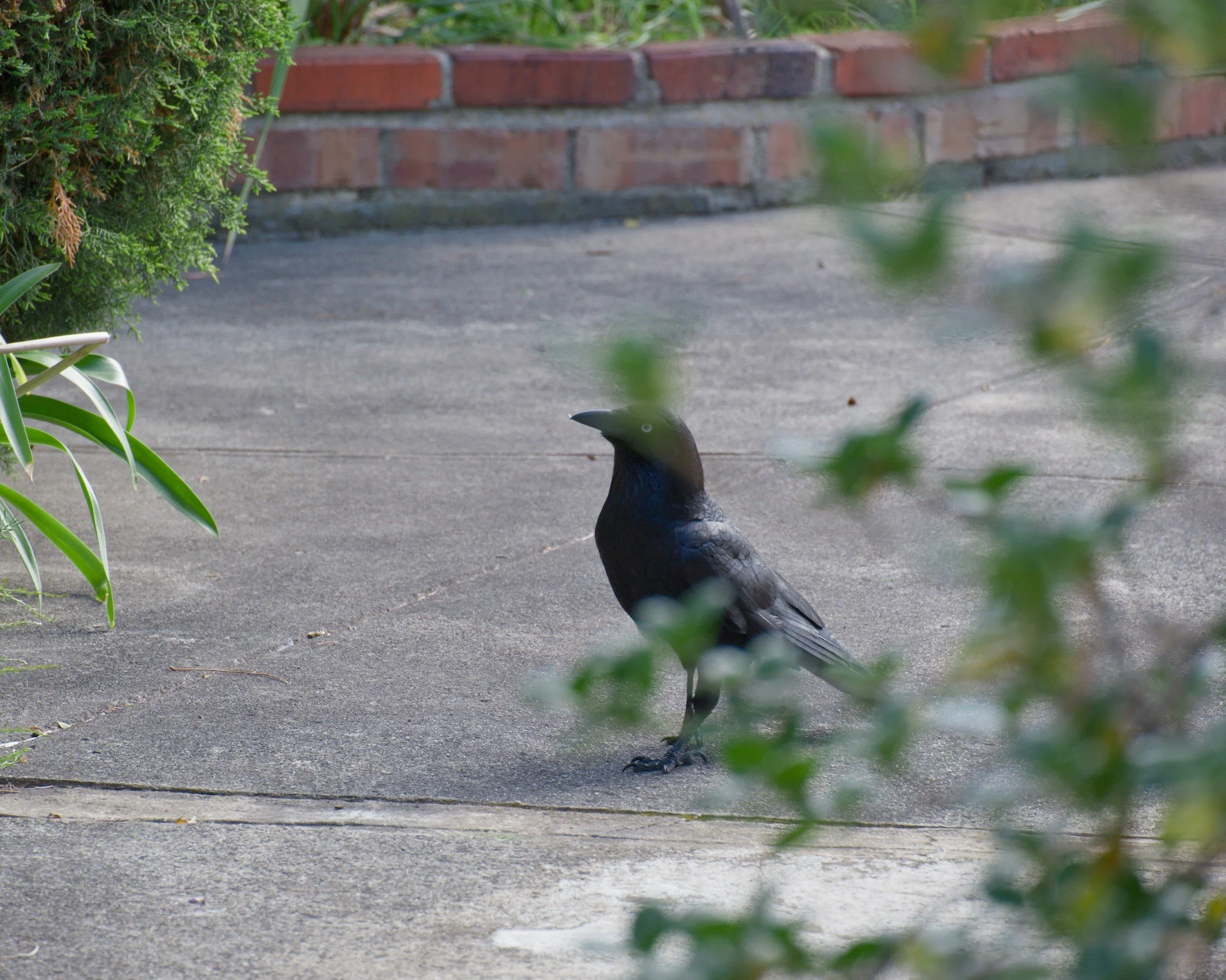 Photo of a Little Raven (a species of raven roughly 1cm shorter than an Australian Raven) that’s standing in a residential driveway. The photographer has taken this photo partly obscured by a bush so as not to startle the bird.