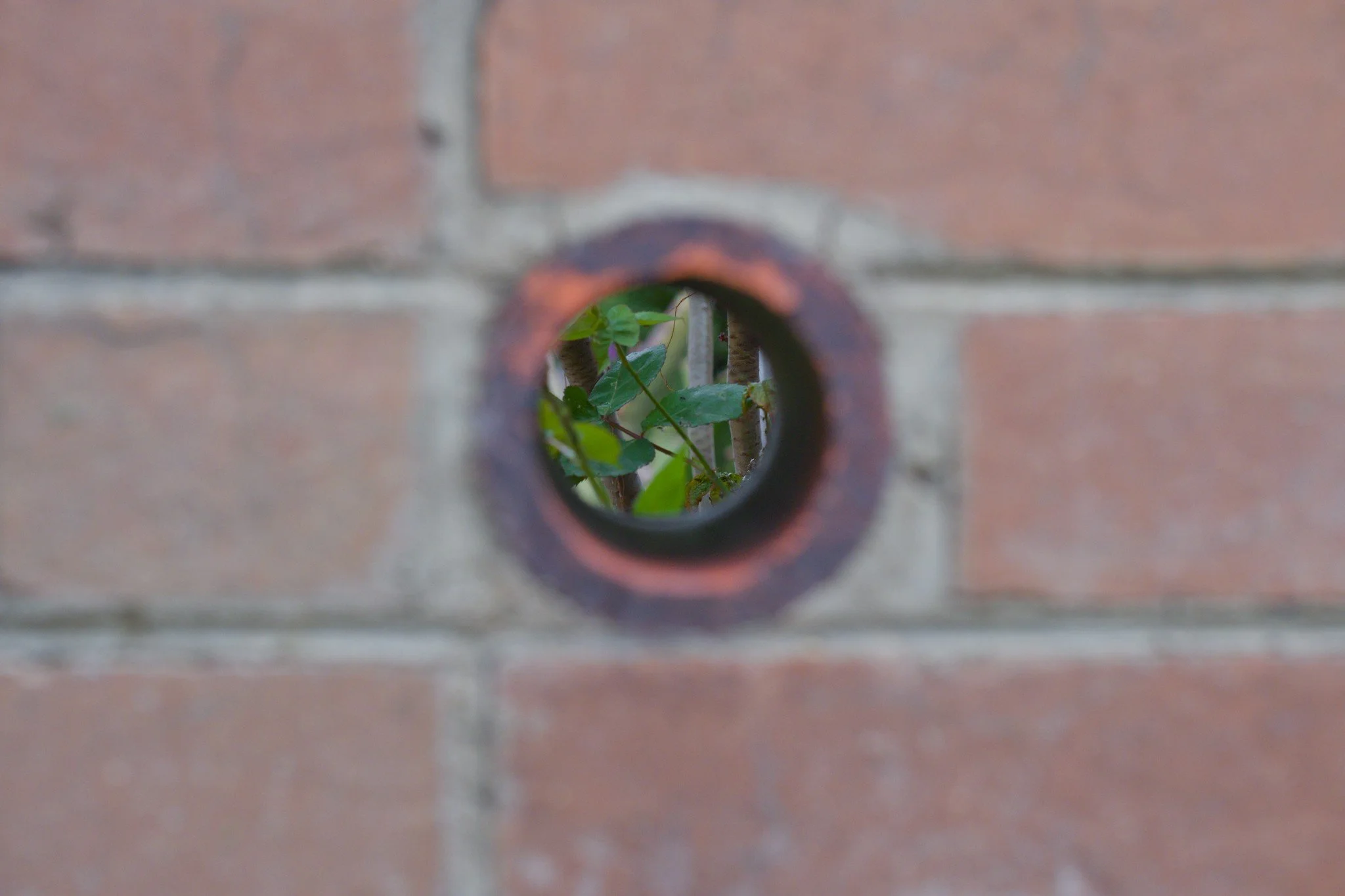 Photo of a residential red-brick wall with a round section cut out of it so a rolled-up newspaper or magazine can be placed in it by the mail carrier. The wall and ring itself are out of focus. What is in focus is a bush that is growing in the garden behind this wall.