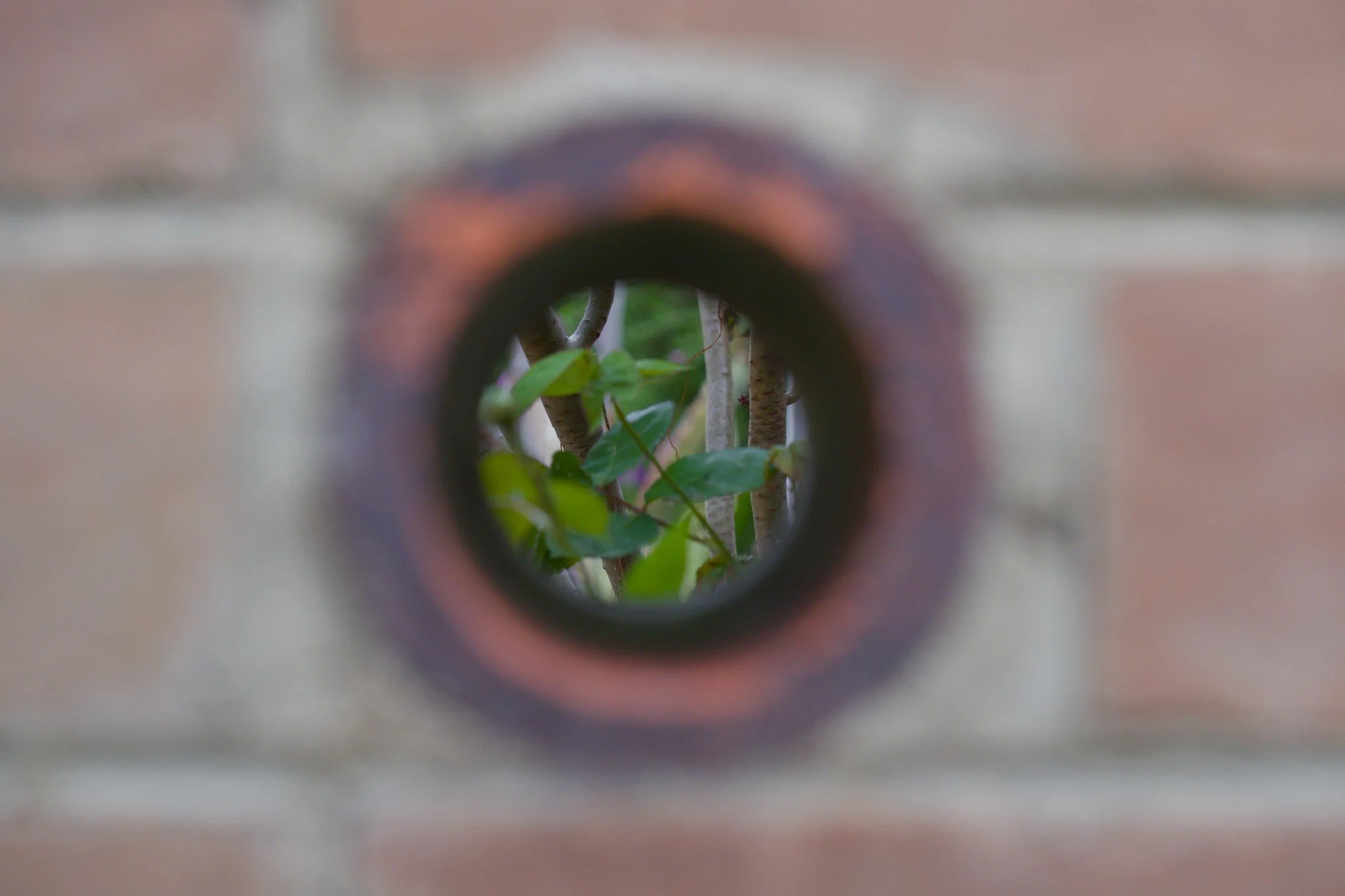 Close-up photo of a residential red-brick wall with a round section cut out of it so a rolled-up newspaper or magazine can be placed in it by the mail carrier. The wall and ring itself are out of focus. What is in focus is a bush that is growing in the garden behind this wall.