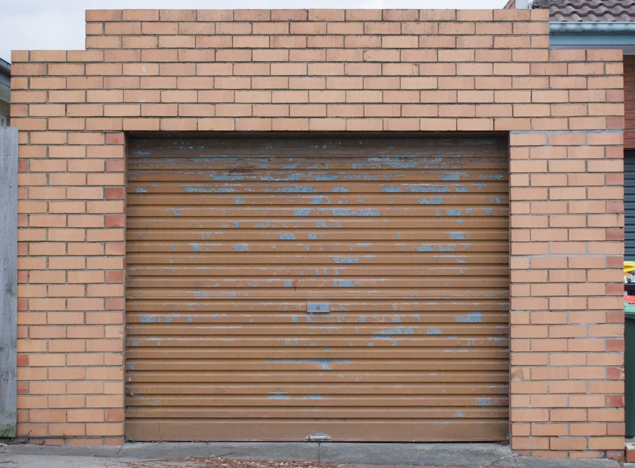 Photo of the brick-lined front of a residential garage with an metal roller door that's been painted in an pink/peach colour that matches the surrounding brickwork. This paint has peeled in several places so the grey of the metal roller door is exposed.