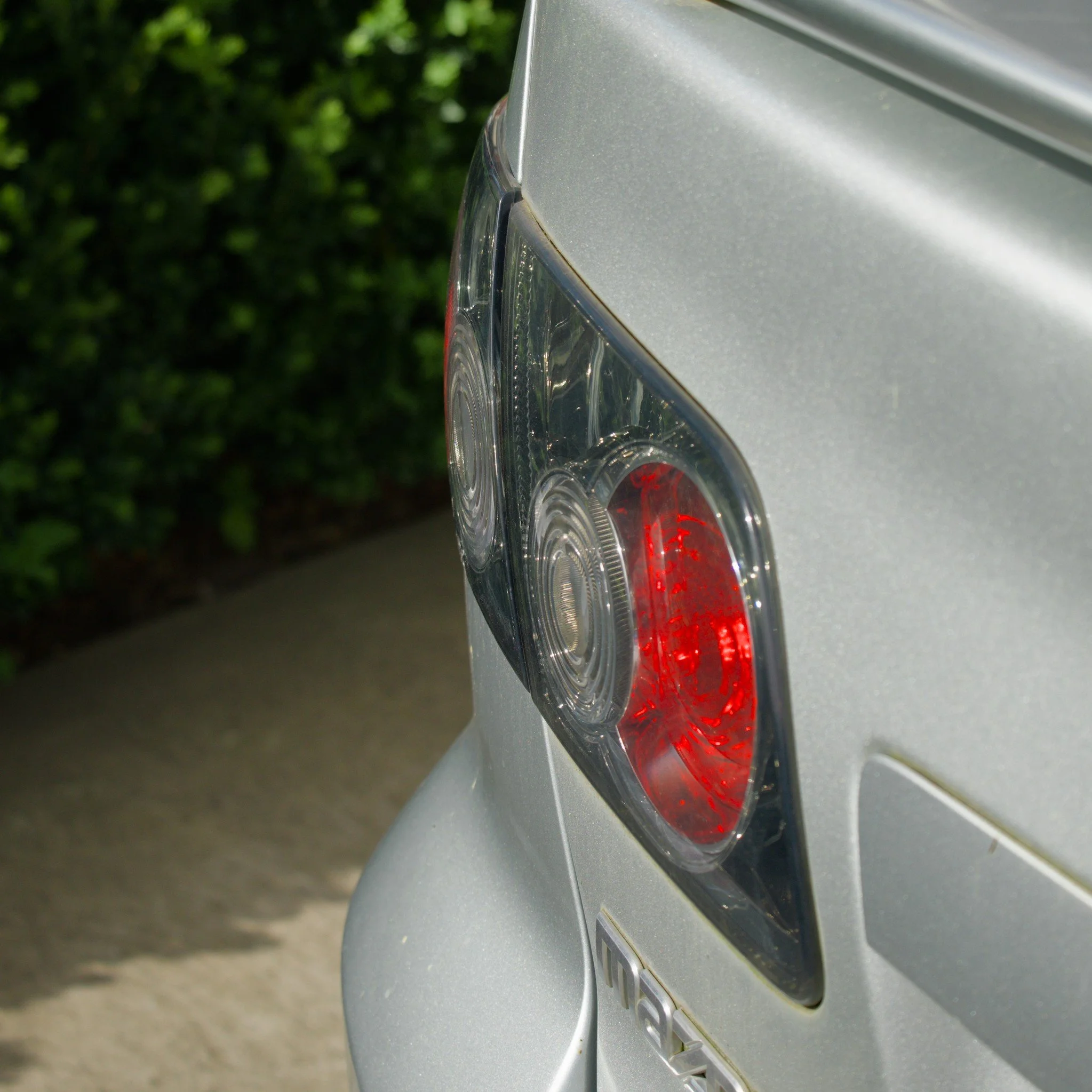 Photo of the brake lights of a silver sedan that are being lit with warm, golden light at sunset.