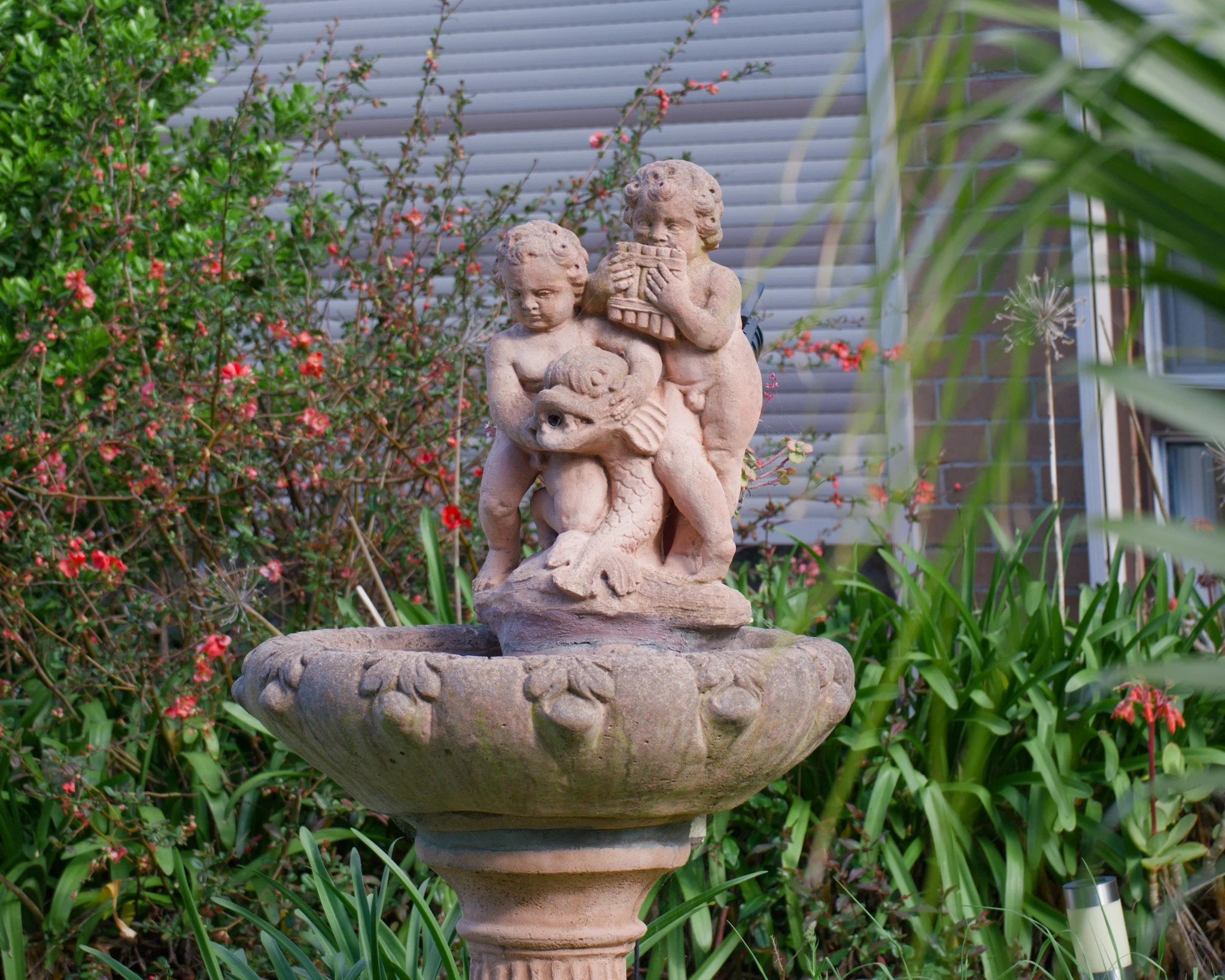 Photo of a vibrant residential garden with a stone fountain that’s mounted on a stone pillar. Both fountain and pillar are made from the same pinkish stone. The fountain contains a statue of two cherubs, one playing the panpipes/pan flute and the other holding a fish. Were the fountain to be running, water would come out of the fish’s mouth.