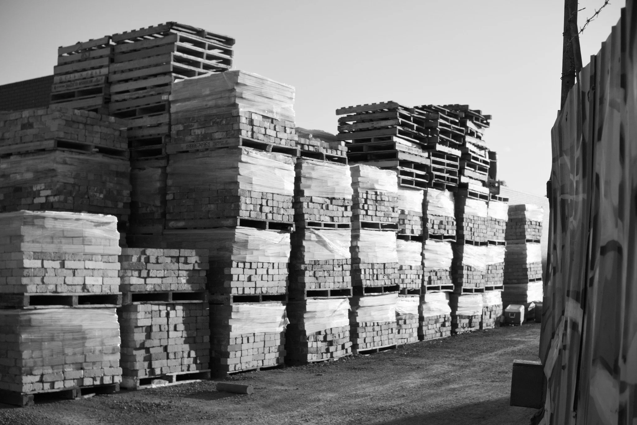 Black-and-white photo of a line of standard transport pallets – the square wooden types that can be easily picked up by forklifts. Each pallet is fully loaded with layers of recycled bricks, the top layers of which have plastic wrap rolled around them. The pallets have been stacked four-high in a large outdoor yard, with several empty pallets on top of these already high stacks.
