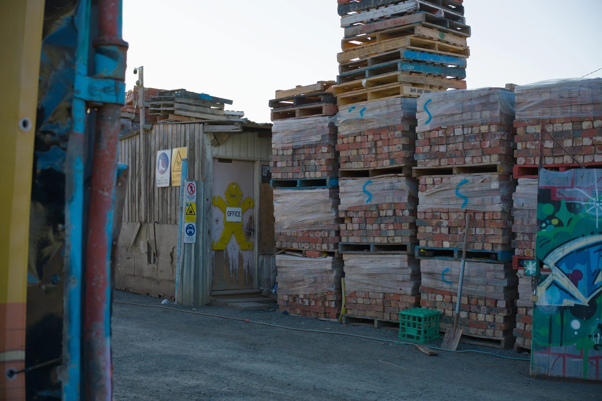 Photo of a line of standard transport pallets – the square wooden types that can be easily picked up by forklifts. Each pallet is fully loaded with layers of recycled bricks, the top layers of which have plastic wrap rolled around them. The pallets have been stacked three-high in a large outdoor yard, with several empty pallets on top of these already high stacks. Also on this yard is a medium-sized wooden shed. A sign on the door of this shed reads, in all capital letters, “office”.