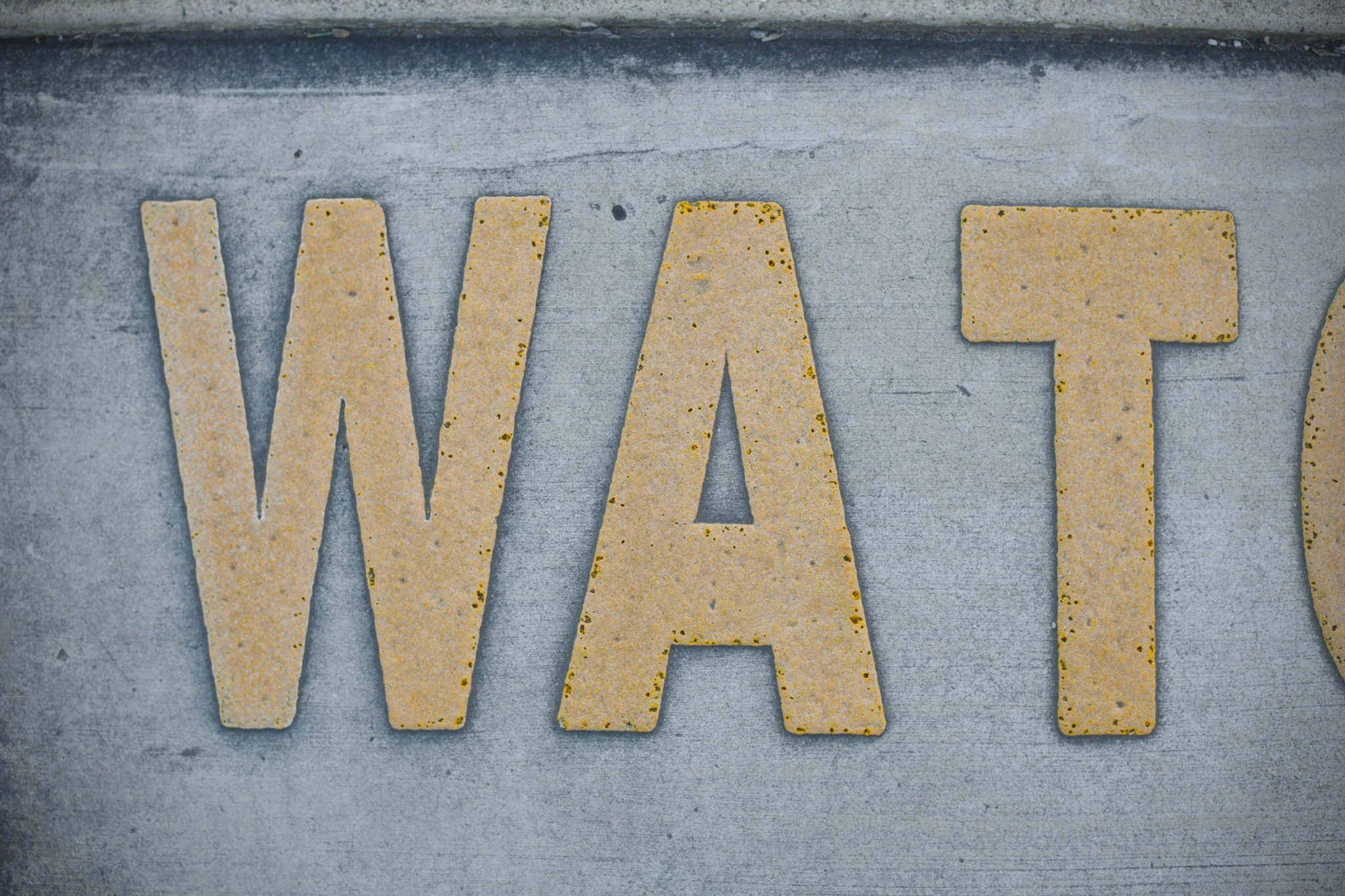 Photo looking down at a pavement with a large, yellow warning sign painted across it. The full sign reads, “watch for cars” but the photographer has cropped-out most of the message so all that’s visible in the frame are the first three letters, “wat”.