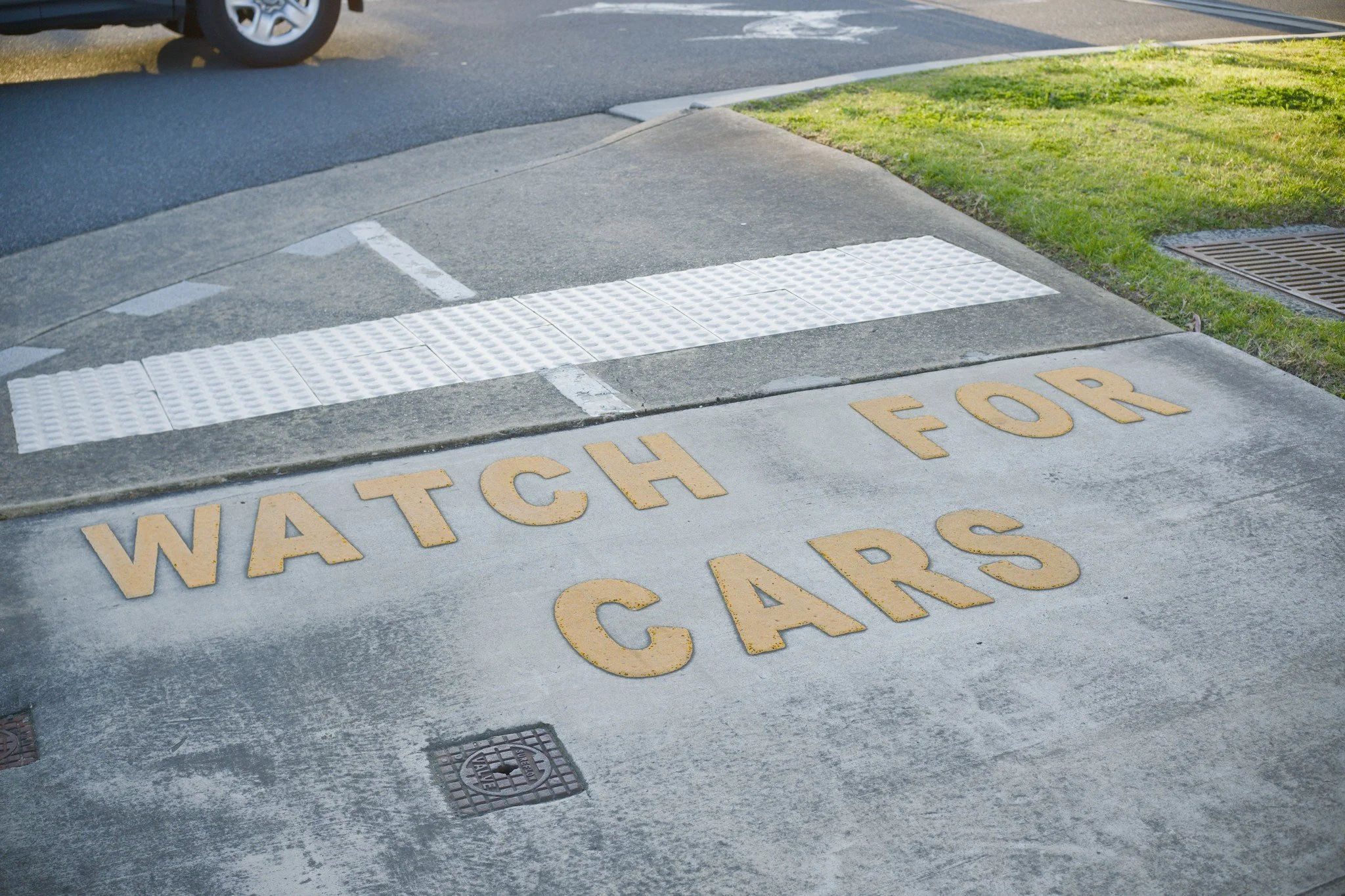 Photo of a combined walking-cycling path that meets a road with a curb cut/ramp that is designed to let wheeled vehicles get on and off this path easily. A strip of tactile paving has been installed across the path just before the curb cut begins. A little behind that strip of bumps is a warning sign painted across the path in large, yellow, all-capital letters that reads, “watch for cars”.