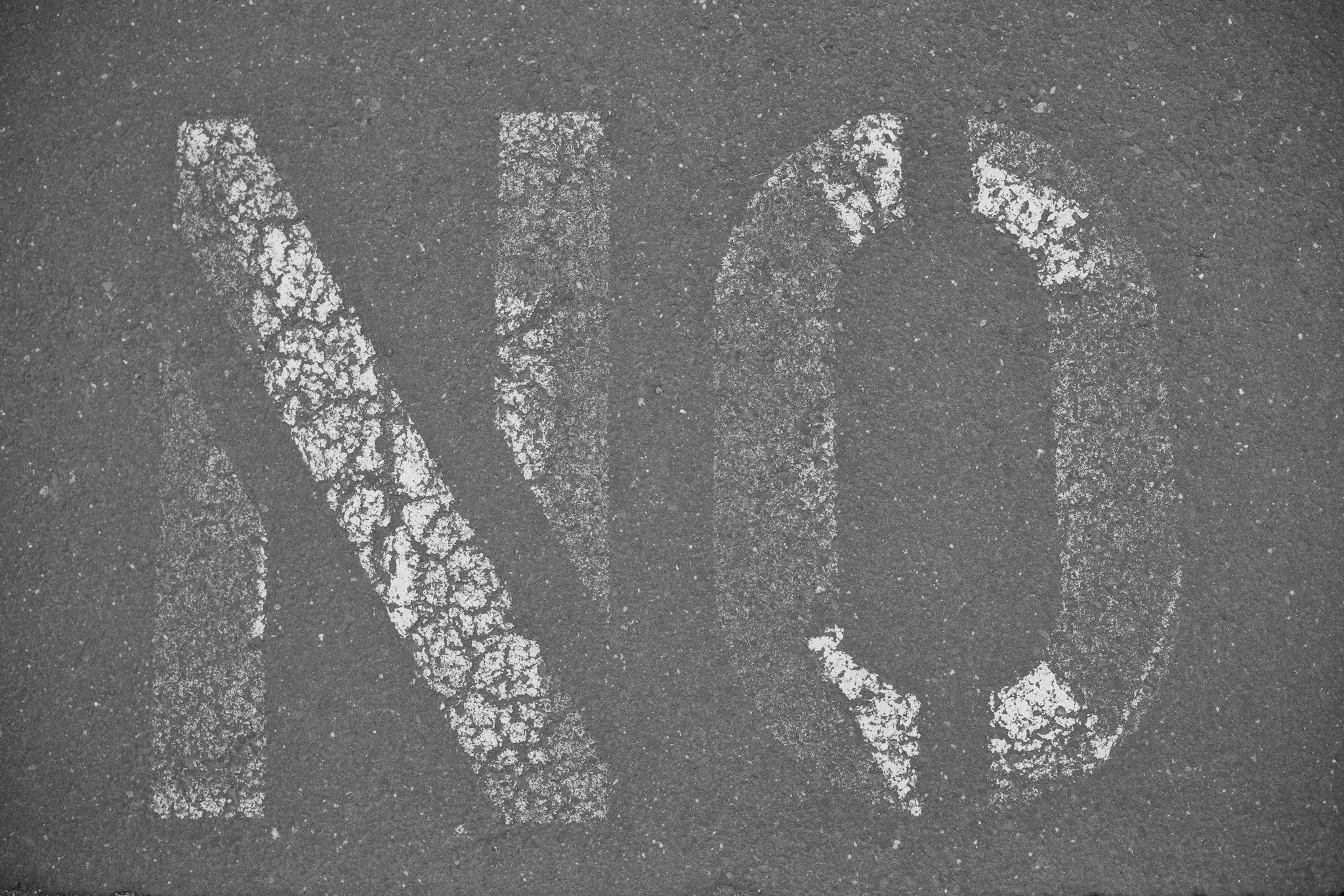 Photo looking down at part of a faded sign on a road. All that is visible in the frame of the photo is the word, painted in white, all-capital letters, “no”.