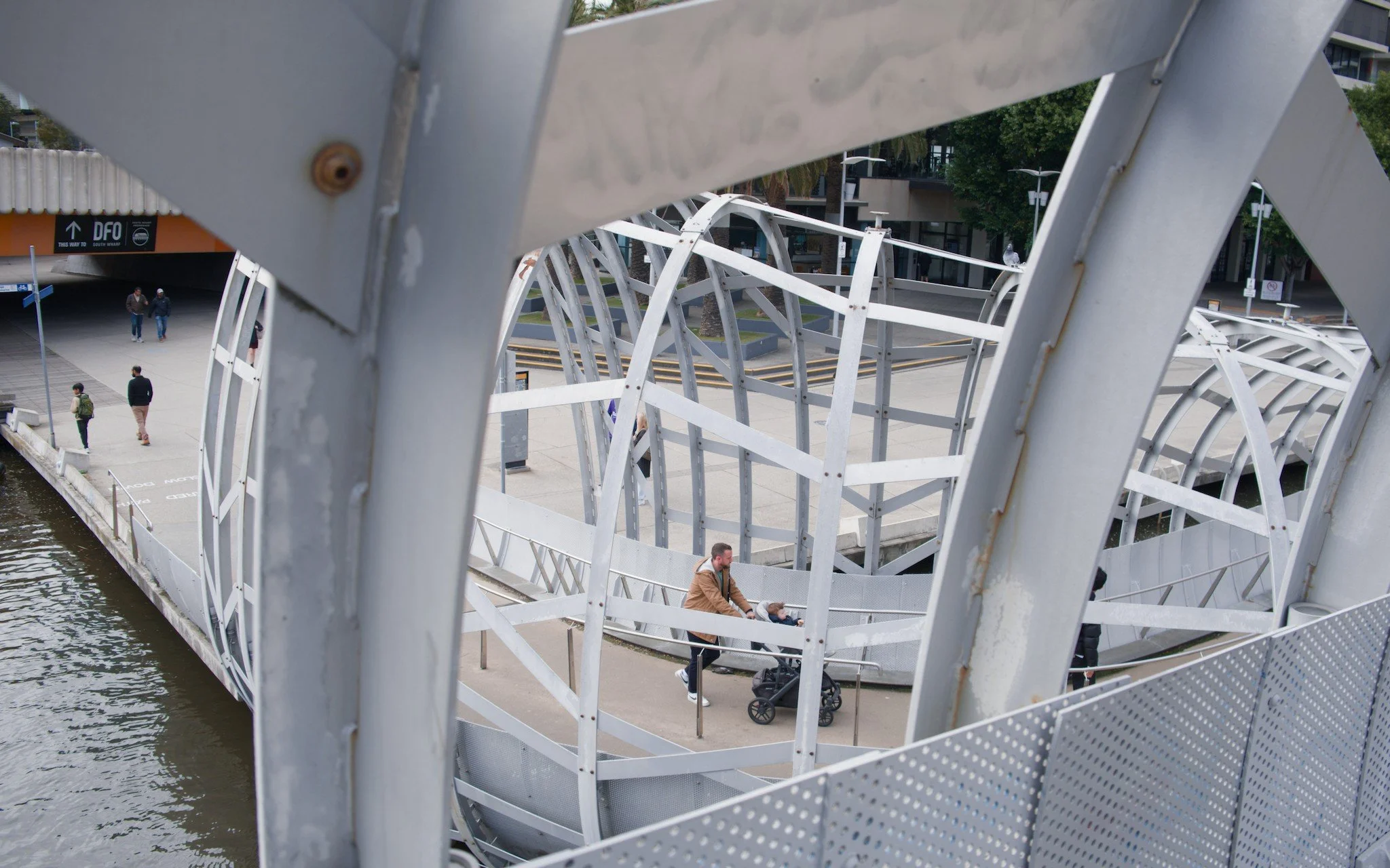 Pushing a pram onto the Webb Bridge on the Yarra River