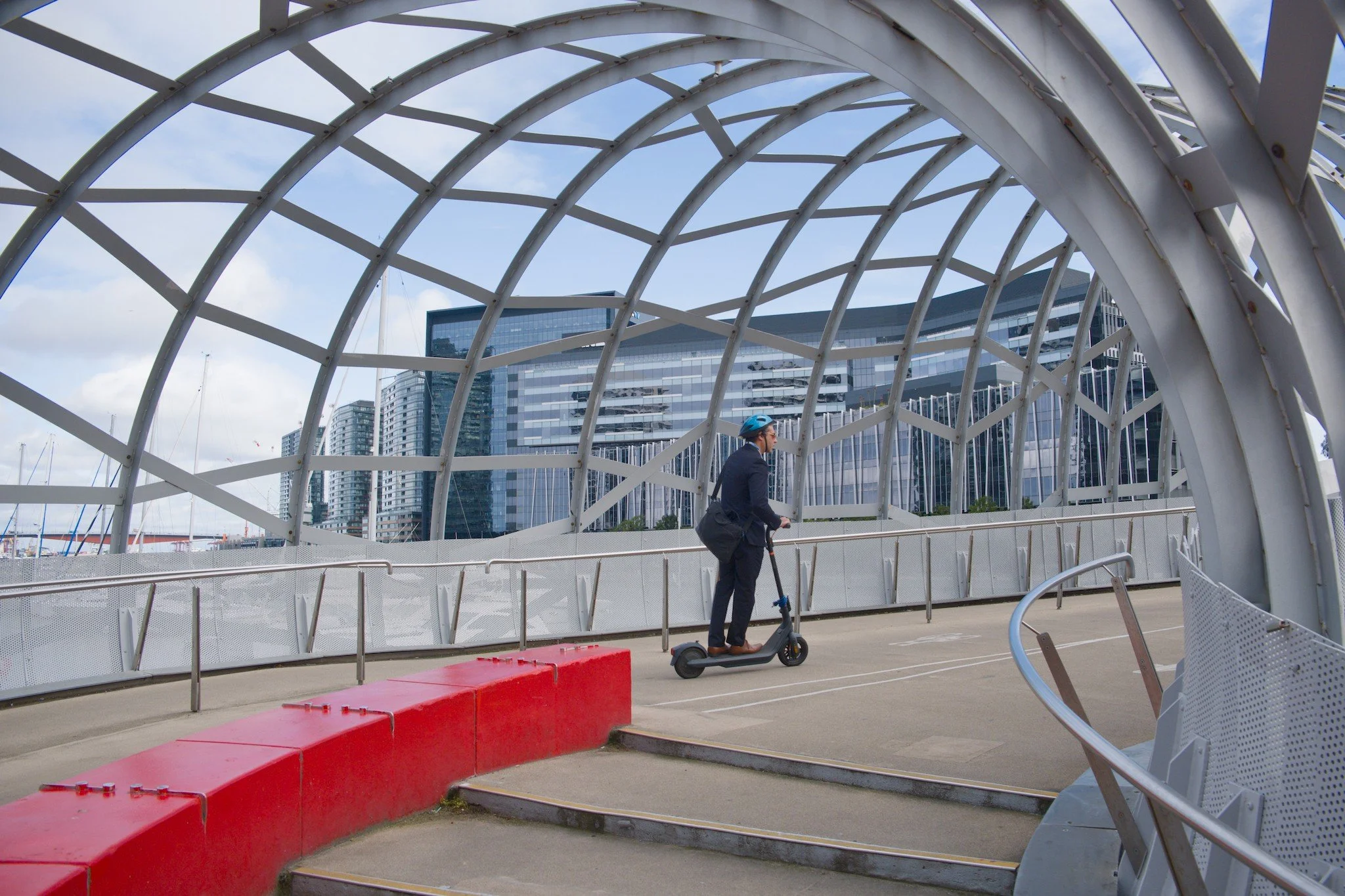 Photo of a man in a dark blue suit wearing a light blue cycling helmet, sunglasses, and brown formal shoes. The man has a black messenger bag slung across his back. The man is riding an electric scooter up a cycling and pedestrian bridge that spans an urban river.