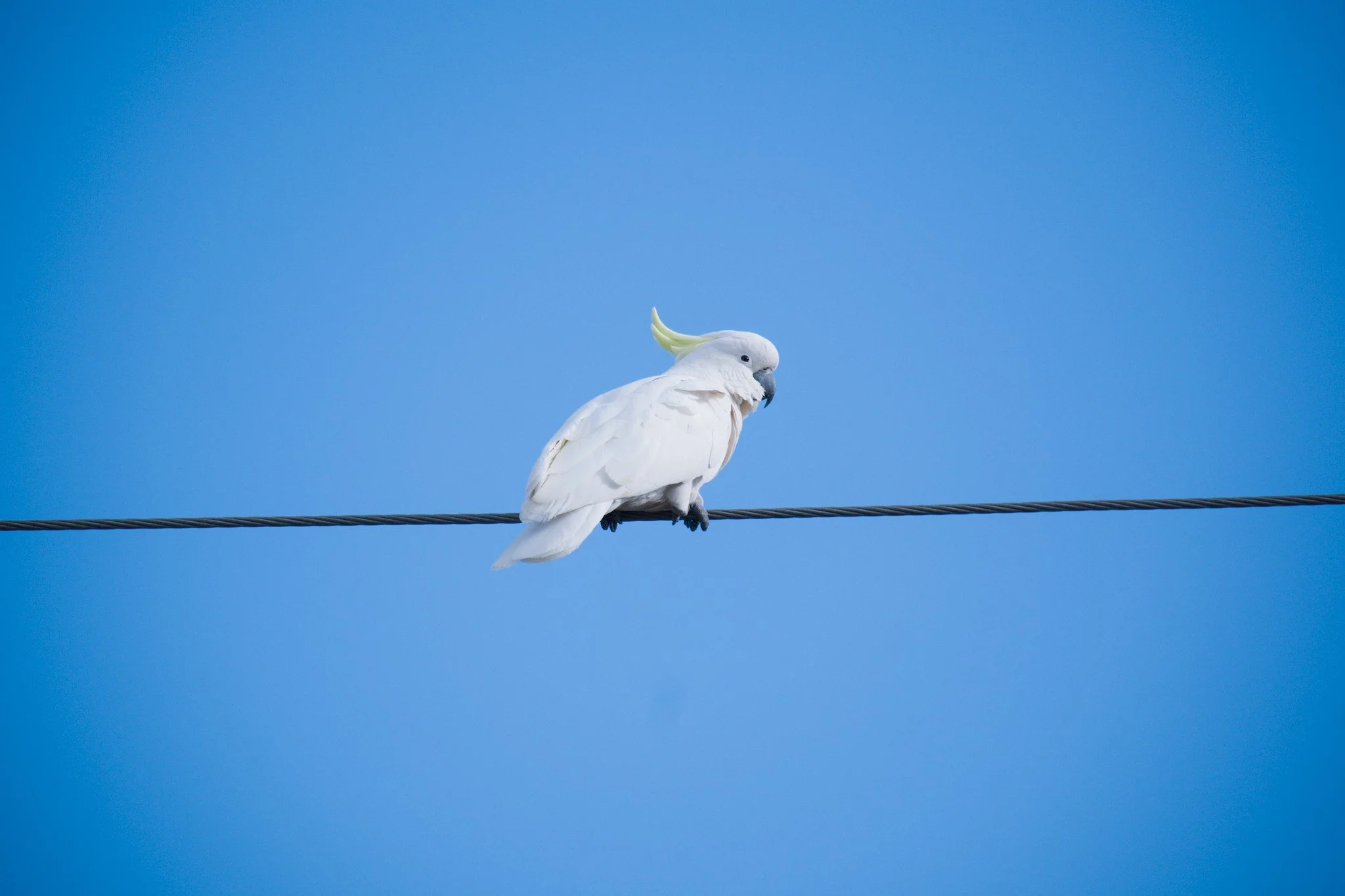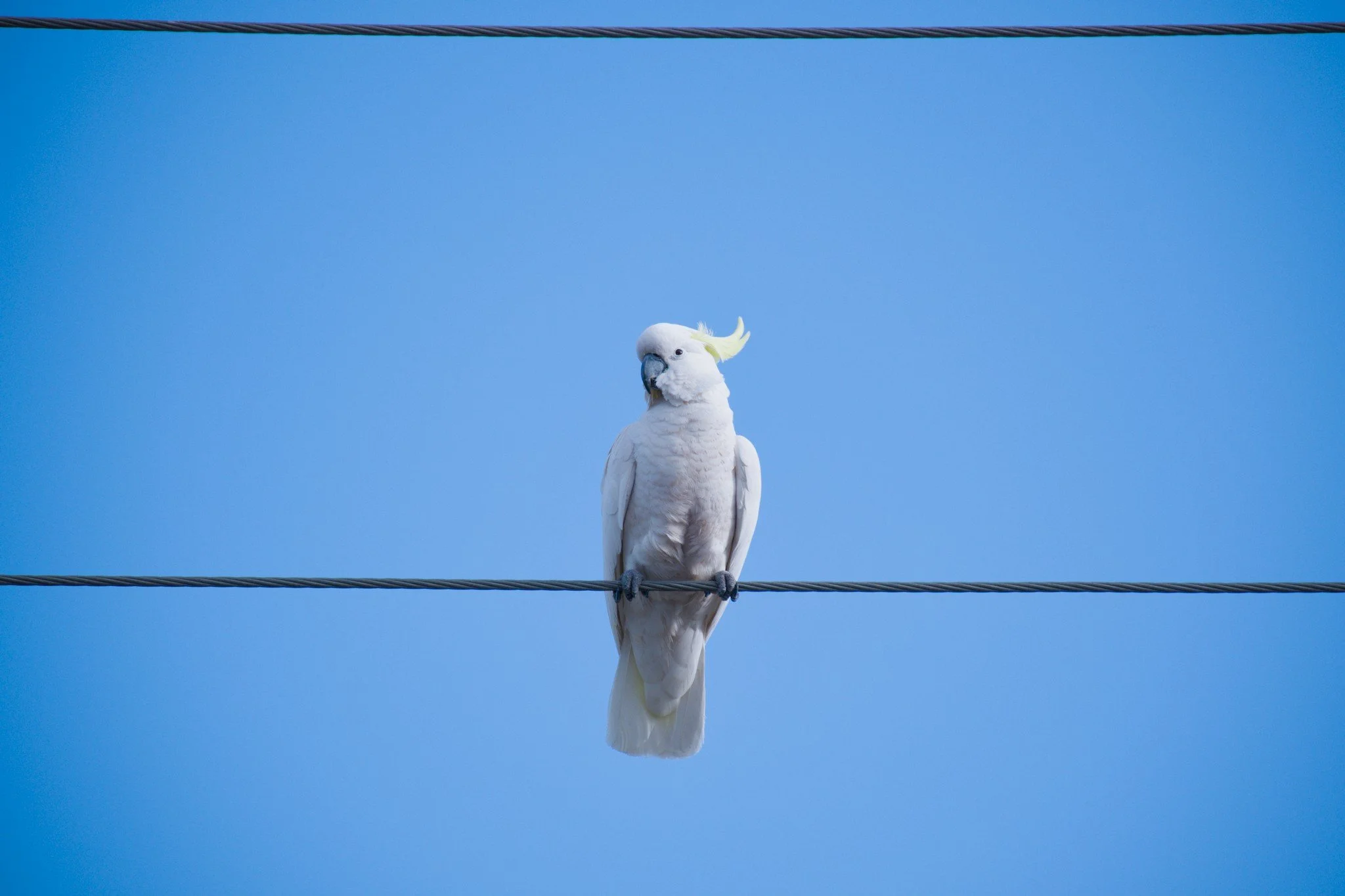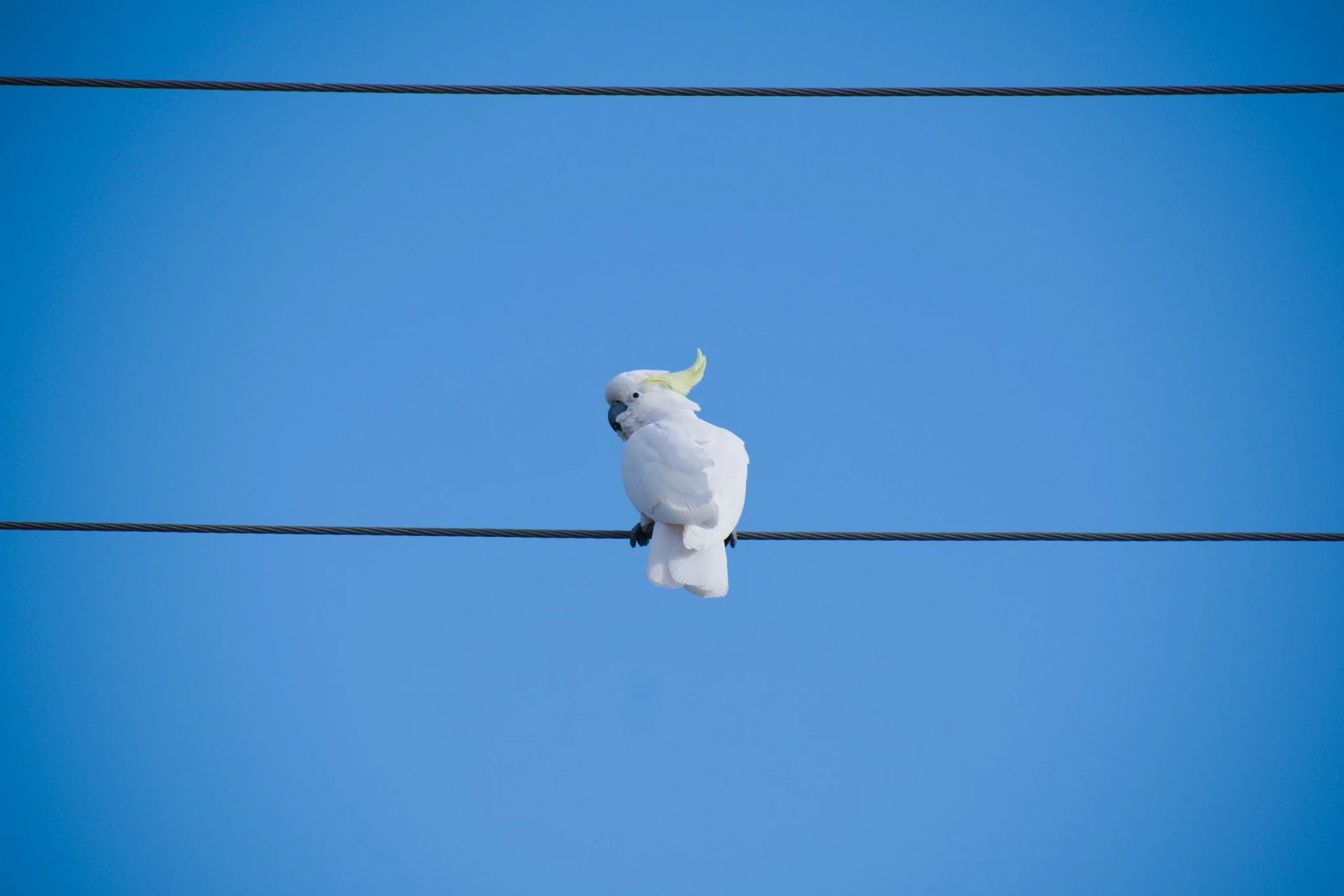 Photo of a sulphur-crested cockatoo sitting on an electric transmission line. The cockatoo has turned the other way and is making sure the photographer is standing still behind it.