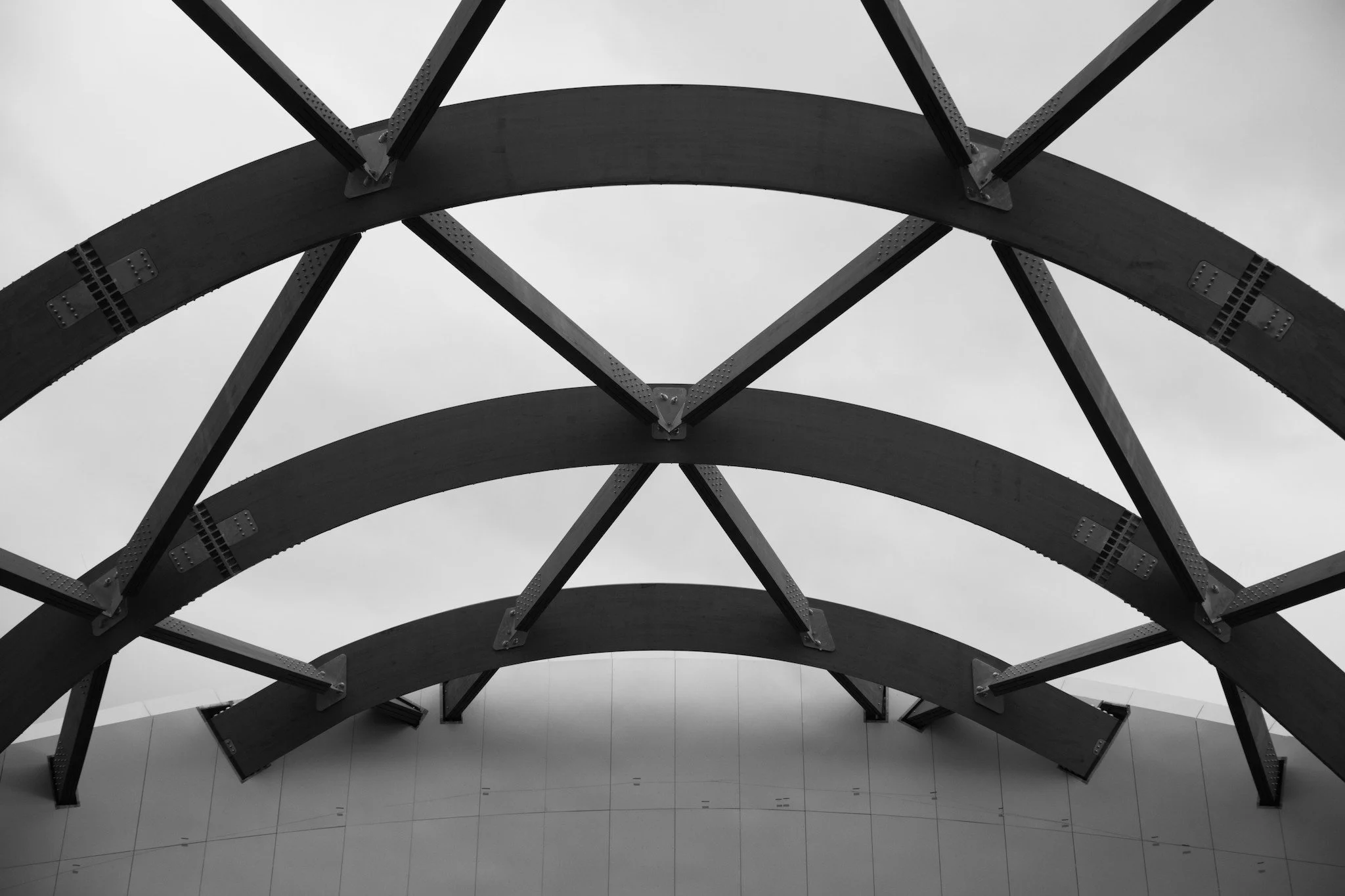Black-and-white photo of the eel-net inspired design of a road tunnel entryway portal. Thick curved beams create successively shallower arches across the entrance. Thinner beams crisscross these large beams at an angle, creating the effect of a traditional eel net.