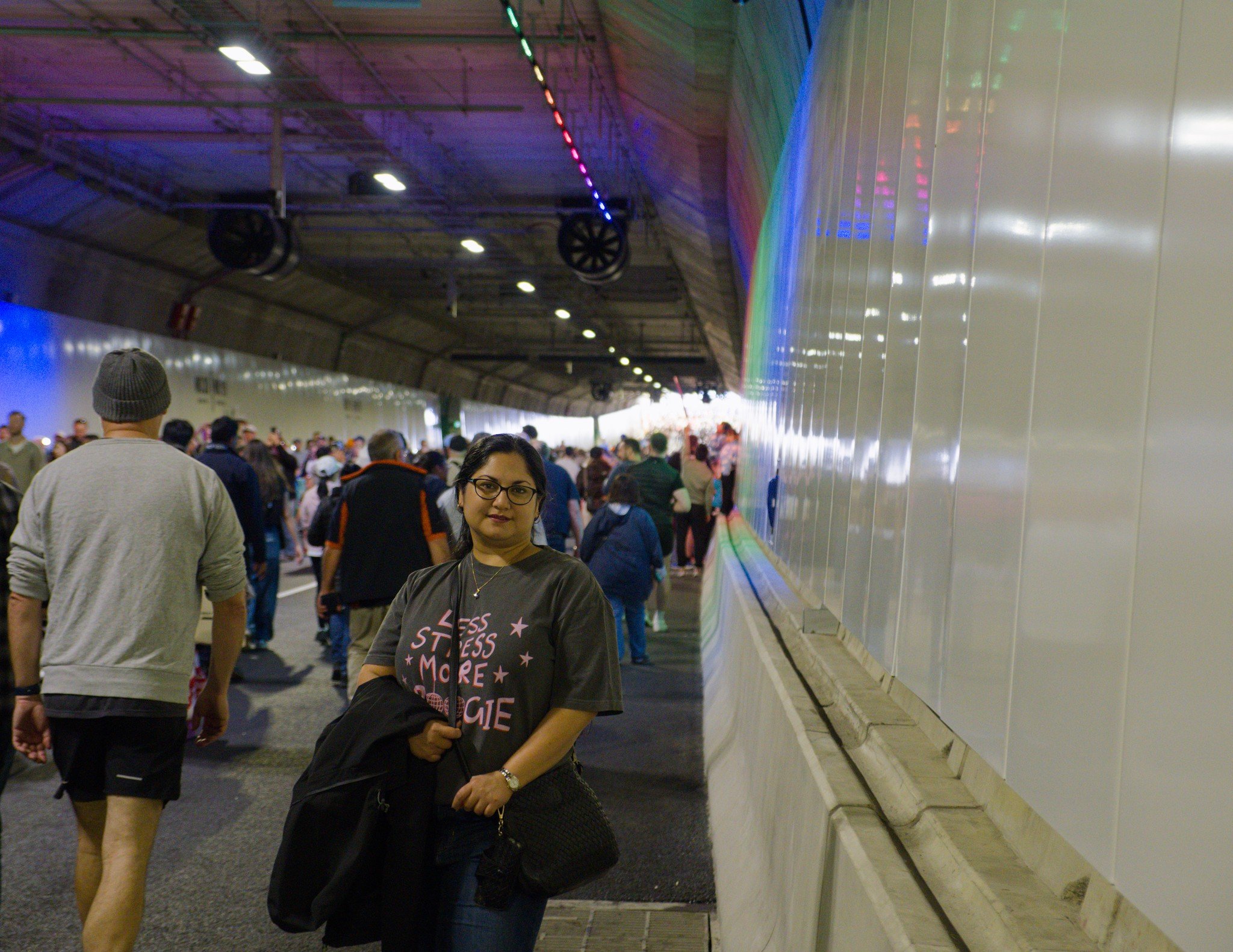 Photo of a woman wearing jeans and a t-shirt posing near the wall of a massive road tunnel. She is surrounded by hundreds of other visitors and you can see the light at the end of the tunnel in the far background of the photo. The woman is wearing jeans and t-shirt, with pink coloured text printed on the t-shirt that reads, “Less stress, more boogie”.