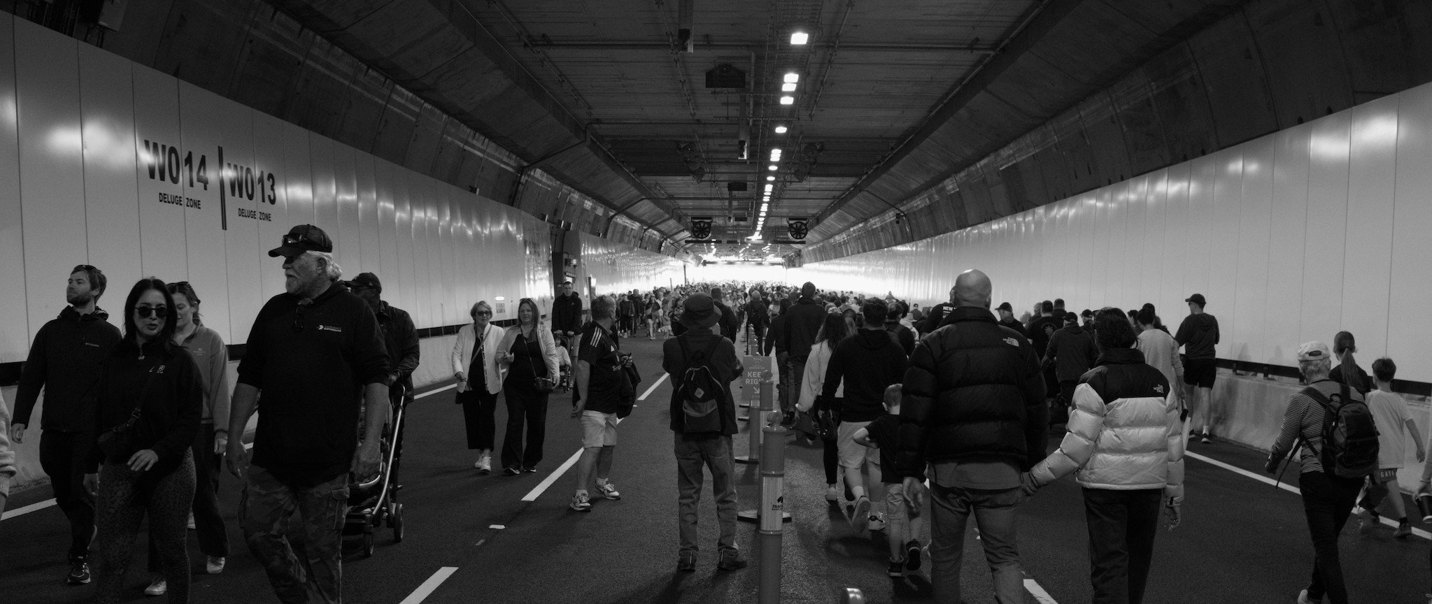 Extremely wide-cropped, wide-angle, black-and-white photo of thousand of visitors walking out a massive road tunnel while, on the left, an equally large number of people are walking in.