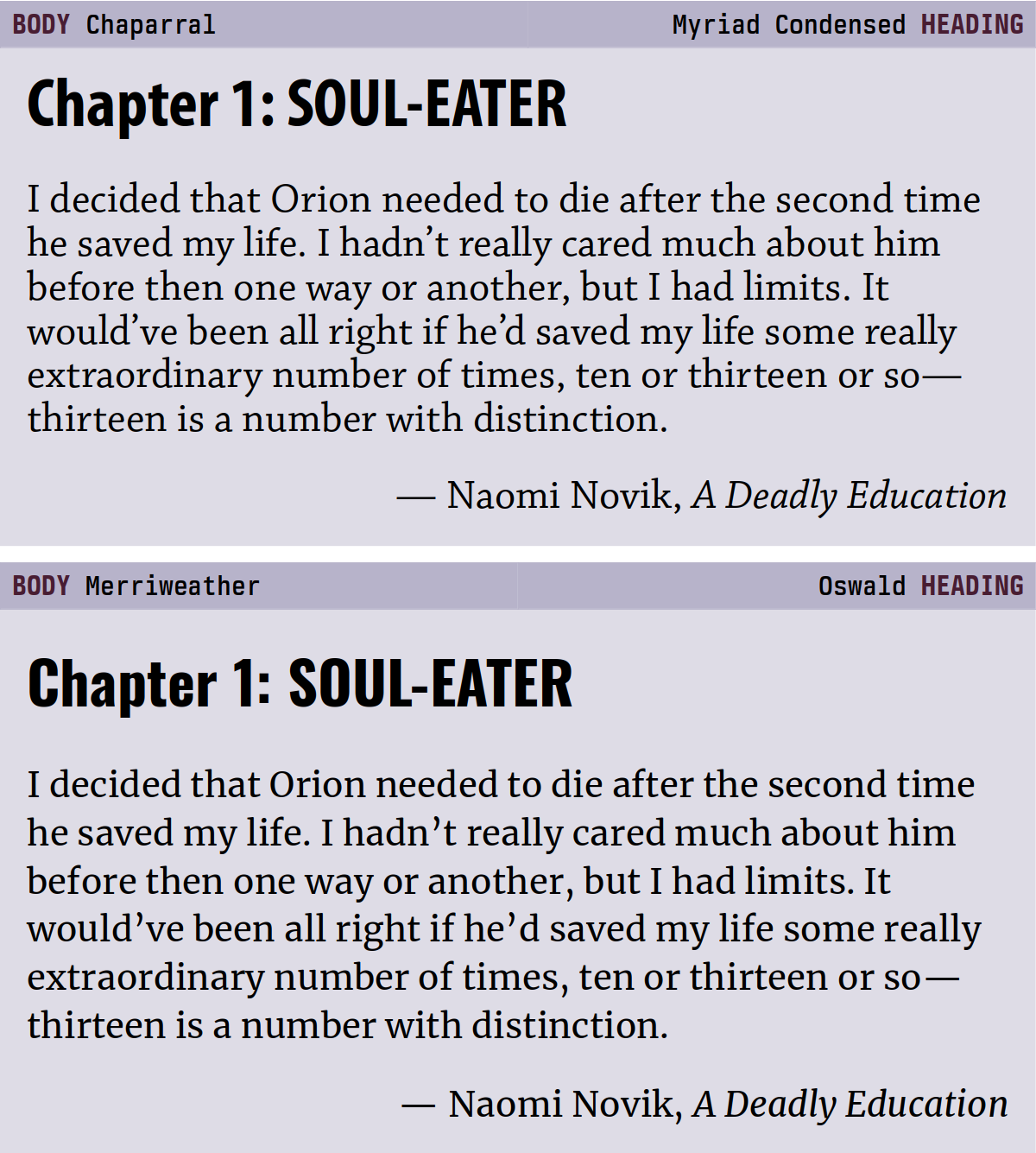 Two graphics showing text set in (1) Chaparral and Myriad Condensed and (2) Merriweather and Oswald. The text has the title, “Chapter 1: SOUL-EATER” and is from Naomi Novik’s book, ‘A Deadly Education’.