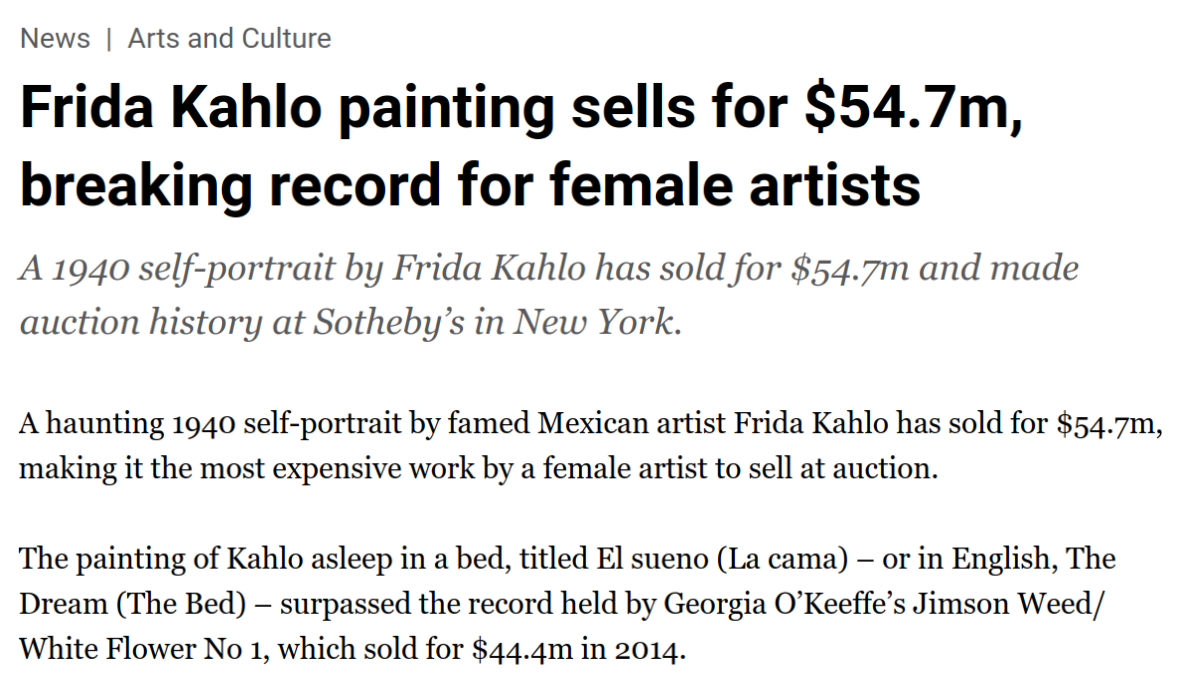 Screenshot from the Al Jazeera website of an article titled, “Frida Kahlo painting sells for $54.7m, breaking record for female artists”.