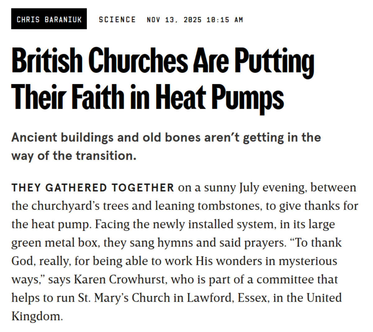 Screenshot from the Wired website of an article titled, “British Churches Are Putting Their Faith in Heat Pumps”.