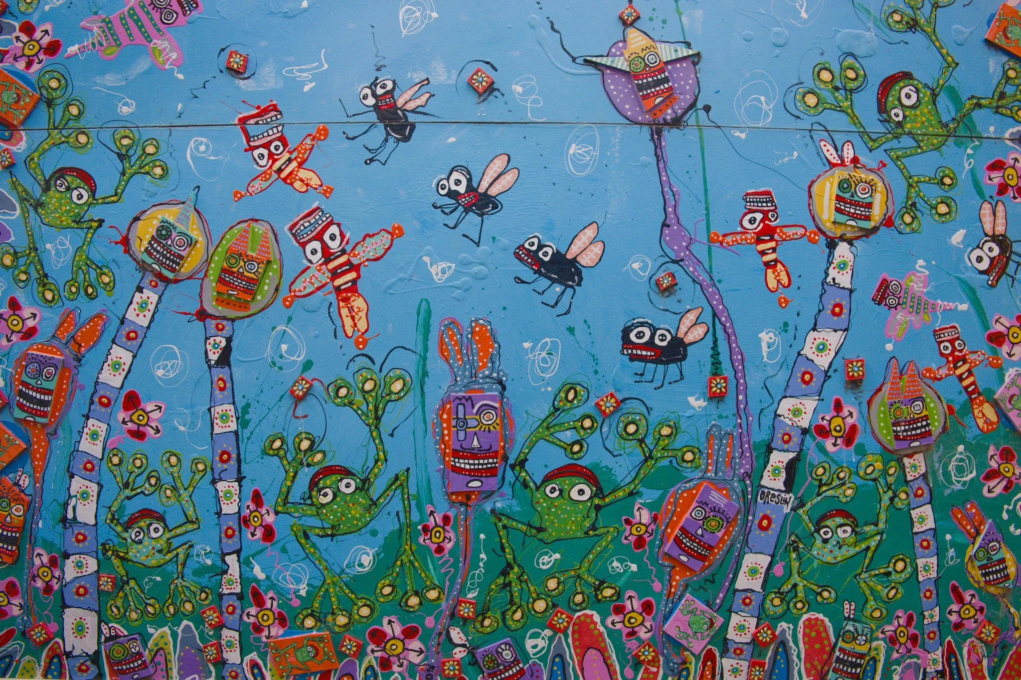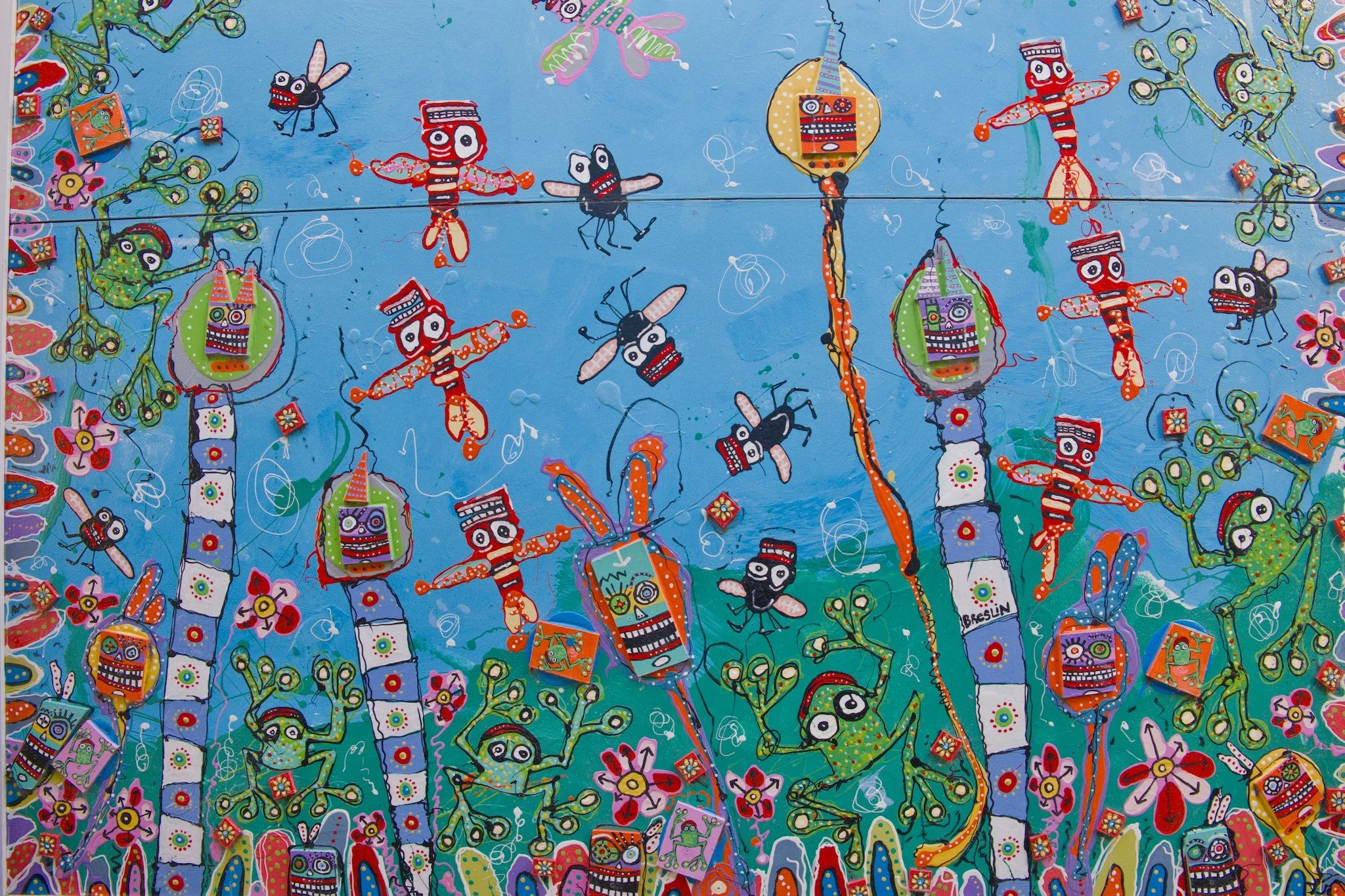 Photo of a vibrantly coloured mural showing fantastical characters that resemble frogs, flies, and other insects. These characters are taken from Anthony Breslin’s children's book Brezania.