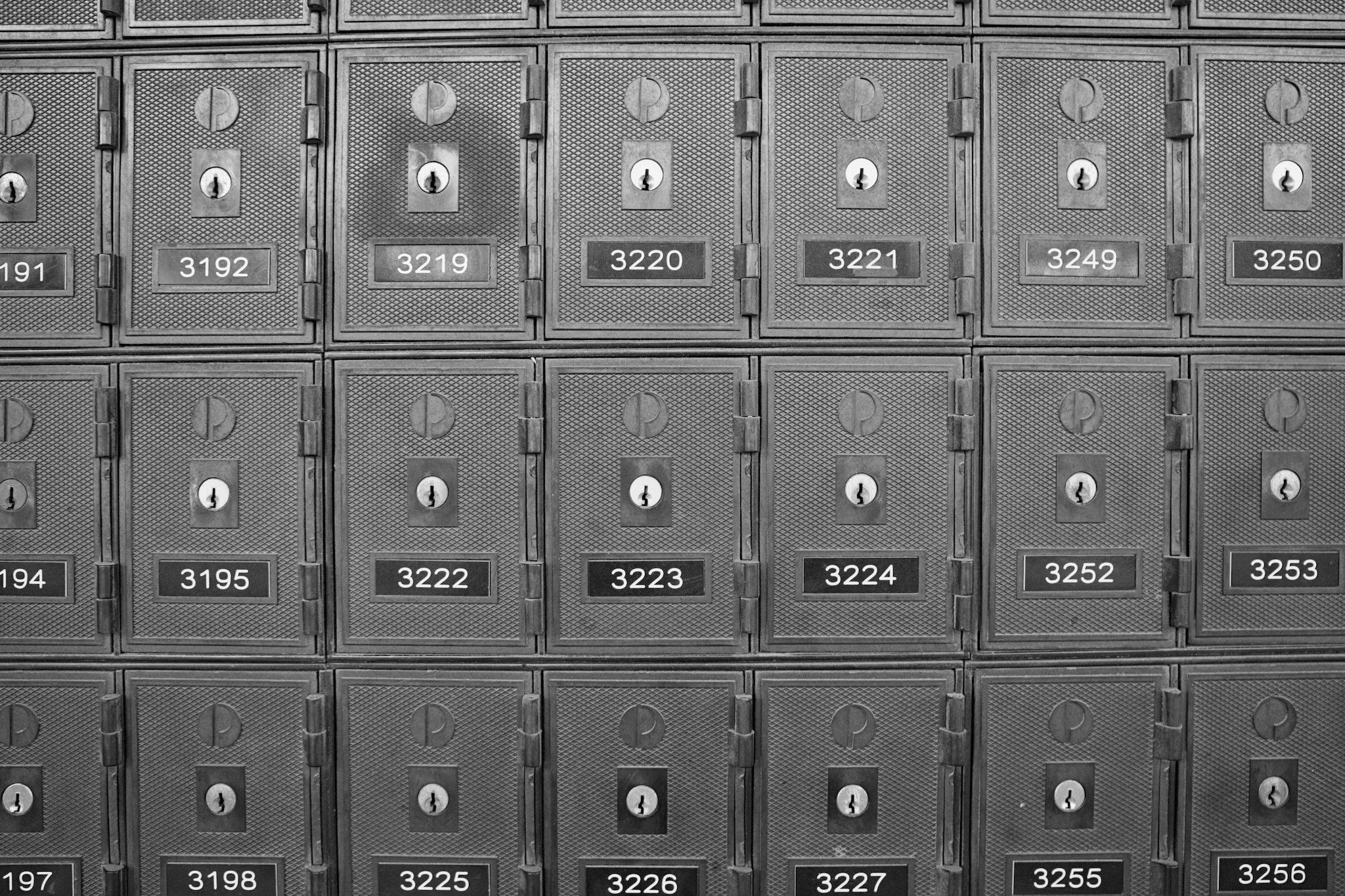 Black-and-white photo of over a dozen post office boxes, each with an embossed Australia Post logo, a keyhole, and a PO box number.