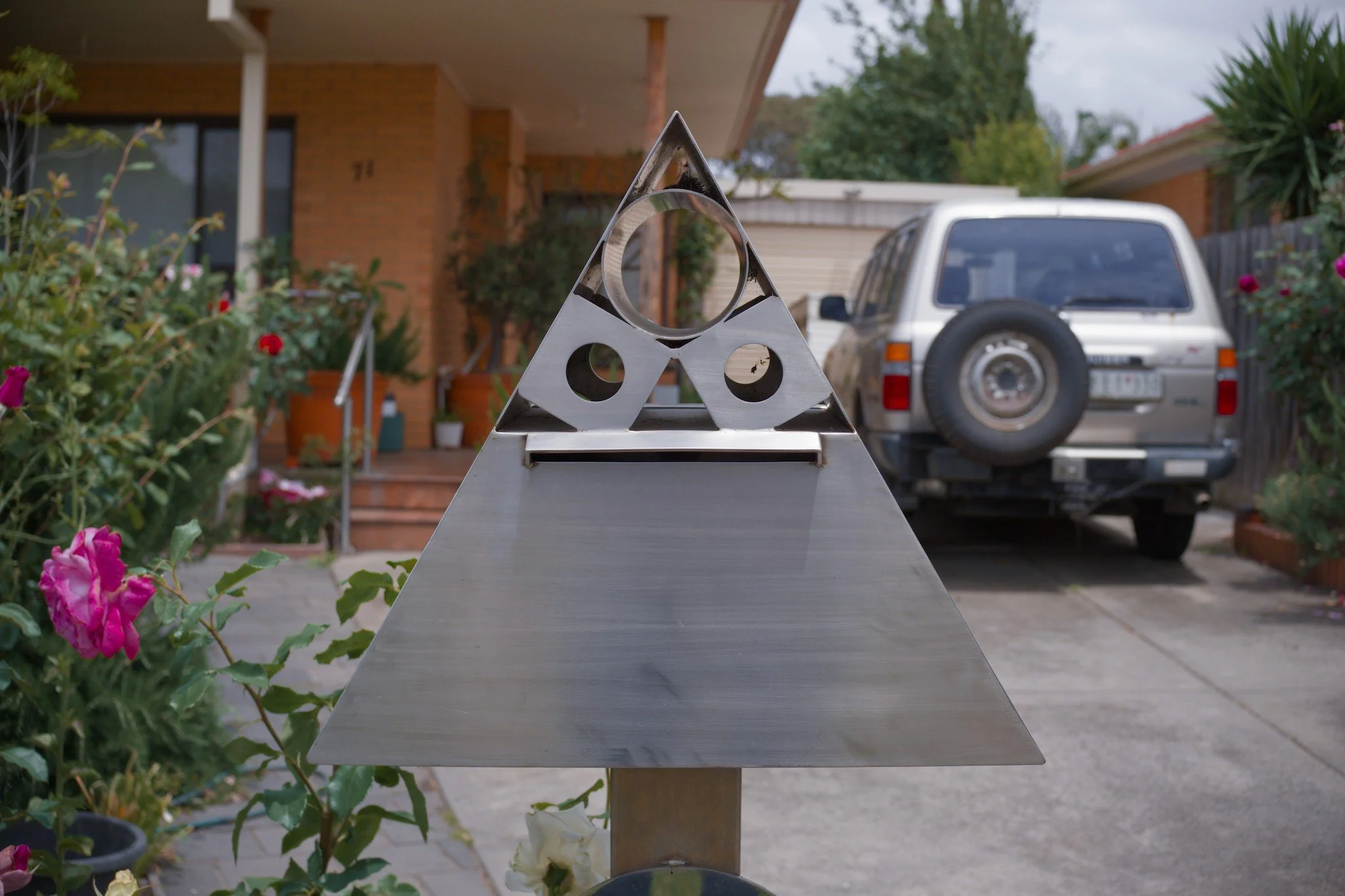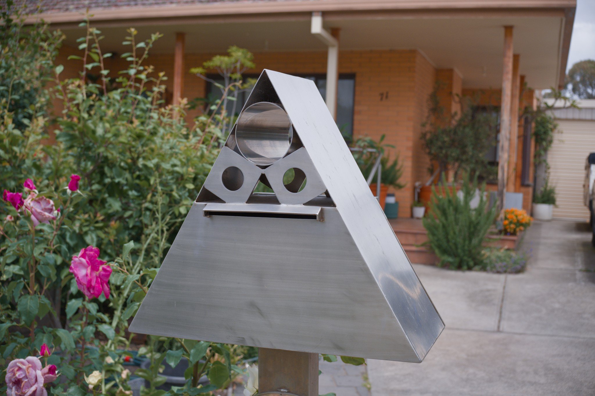 Photo of a triangular, bare metal mailbox outside a house. The mailbox looks like a creature’s head, complete with holes for eyes and the mail slot as its mouth.