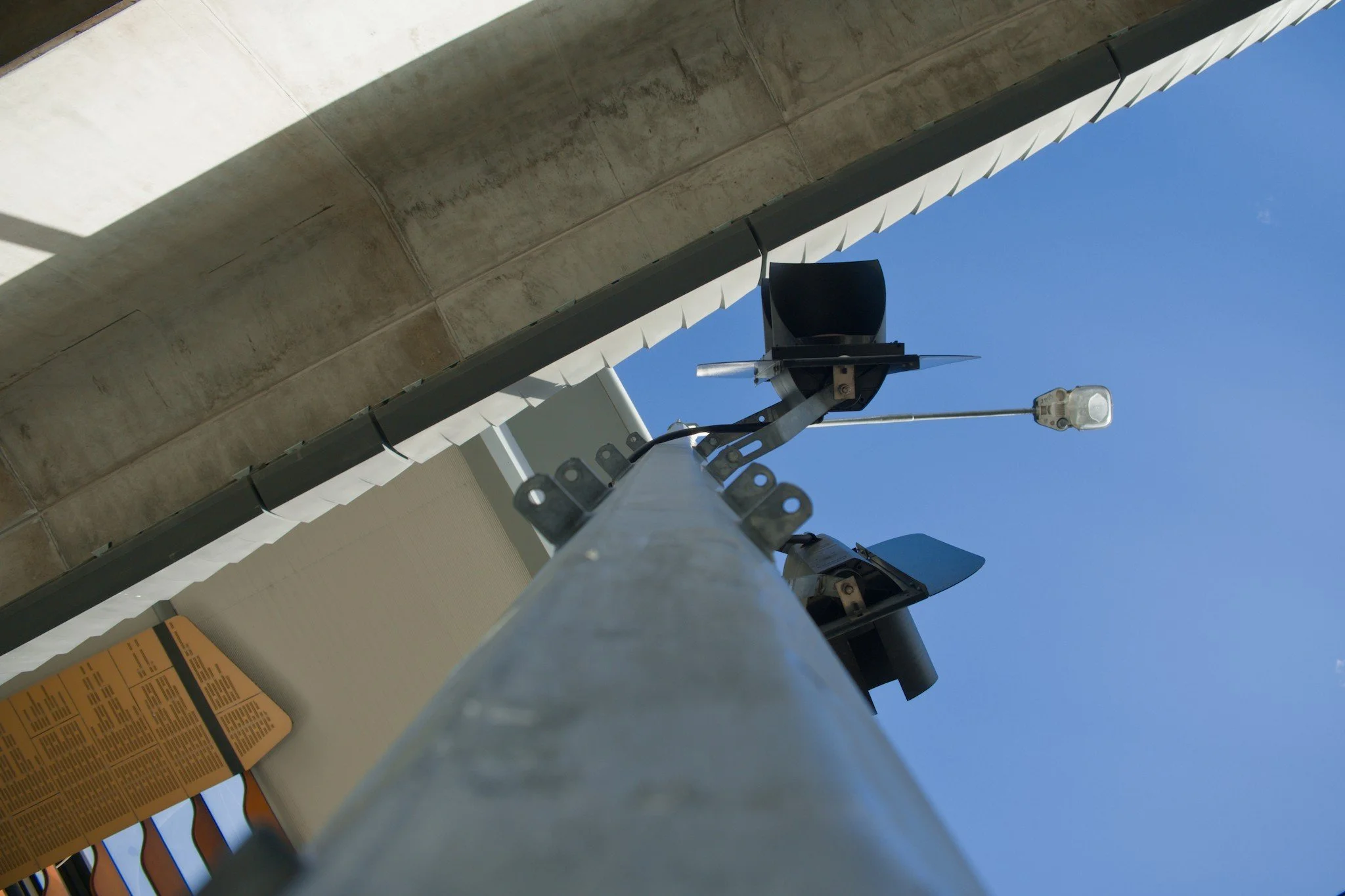 Photo looking straight up along the pole of a traffic light that’s located underneath an elevated railway station.