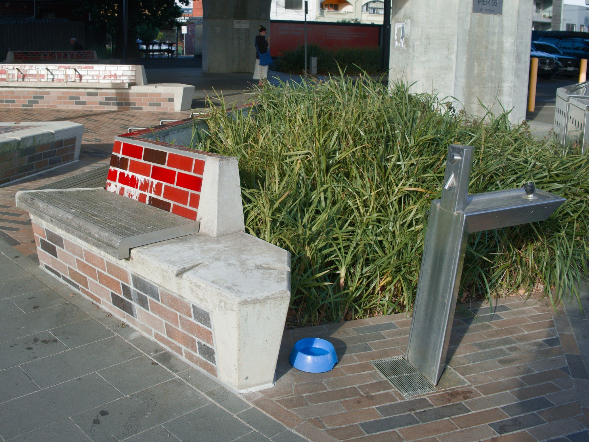 Photo of a stone bench around next to some bushes underneath an elevated train station. Next to the bench is a metal drinking-water fountain. On the floor, next to the fountain, is a bright blue water bowl for dogs.