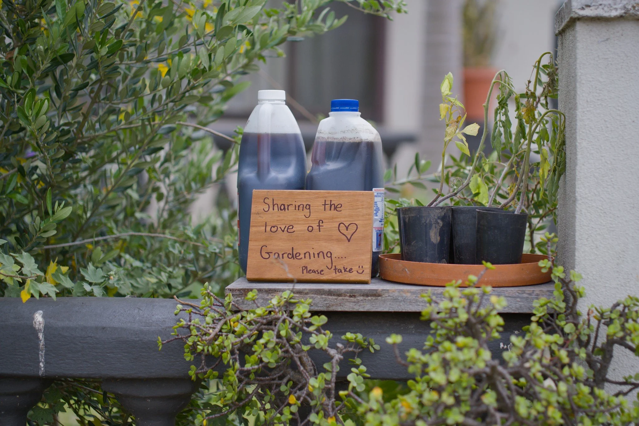 Photo of a two large plastic bottles filled with a dark liquid and a few small plants in plastic pots placed on top of a residential wall. A hand painted sign on what looks like a wooden chopping board reads, “Share the love of Gardening. Please take”, followed by a smiley face.