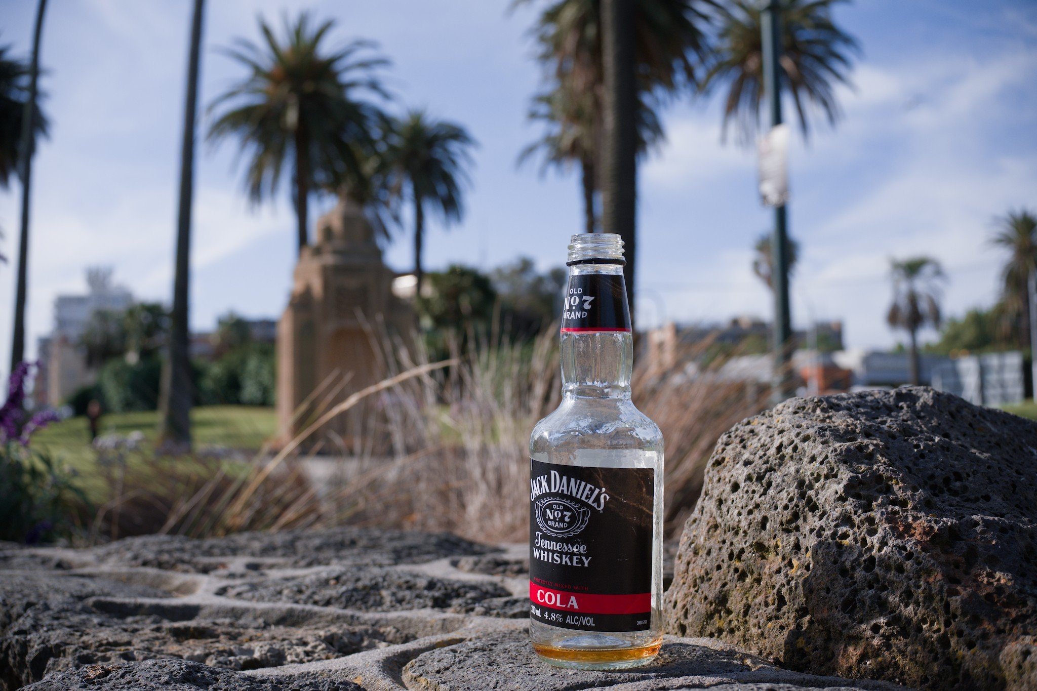 Photo of an almost completely empty bottle of Jack Daniel’s Tennessee Whiskey lying on a stone wall around a public park in a suburb of Melbourne.