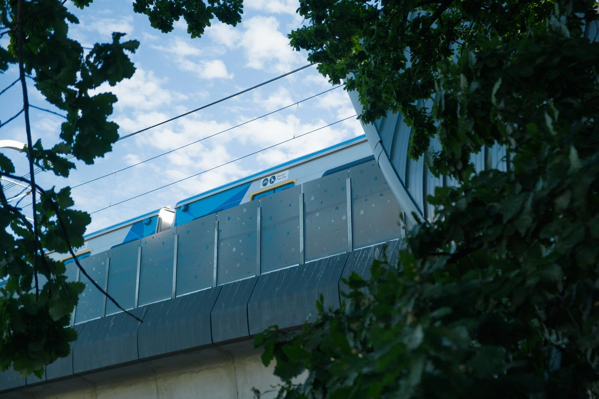 Photo looking up, through the leaf-filled branches of a tree, to an elevated train track and train station platform. A blue, silver, and yellow coloured train has stopped at this platform.